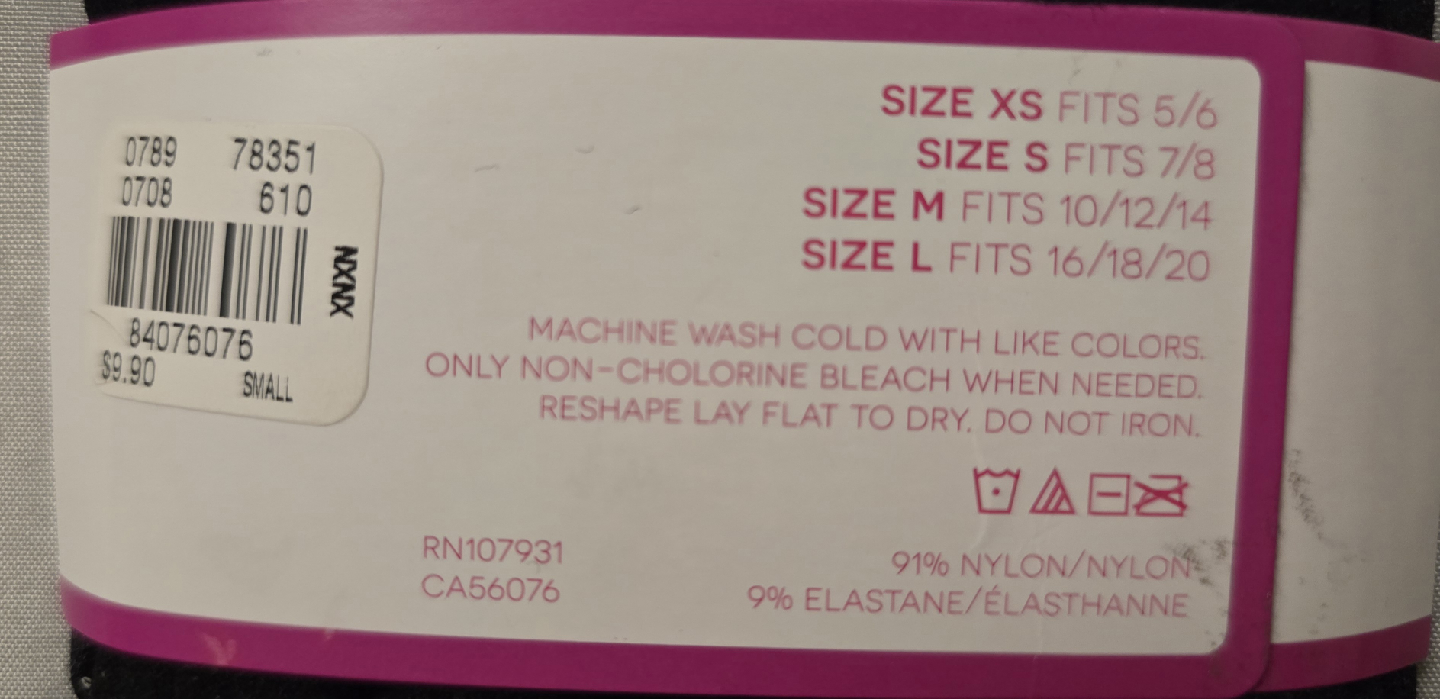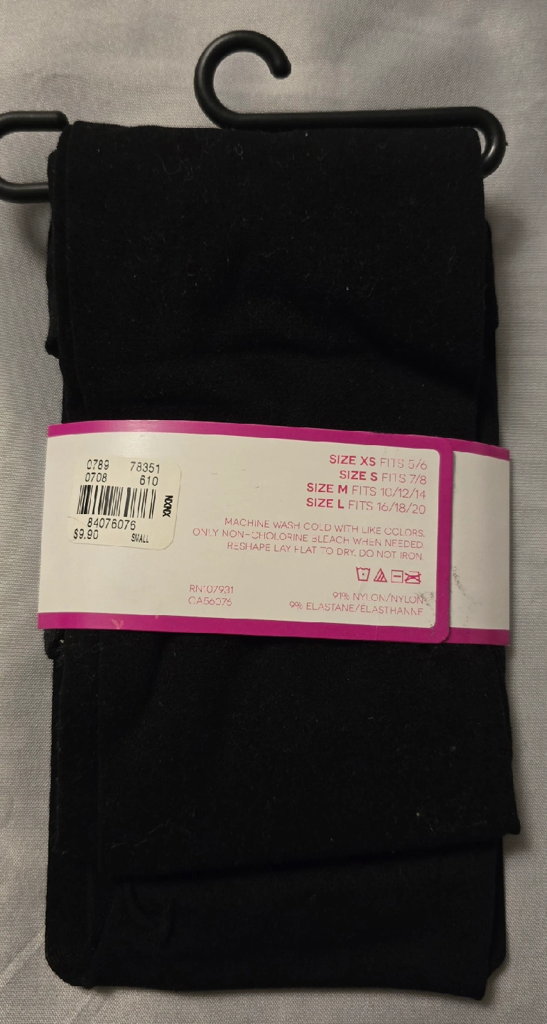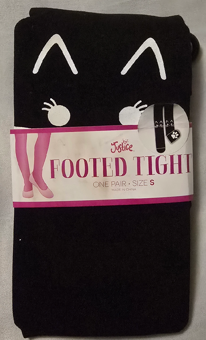 These are a pair of Justice footed tights in size small, which fits sizes 7/8. They are black with a cute cat face design. The material is 91% nylon and 9% elastane/élasthanne