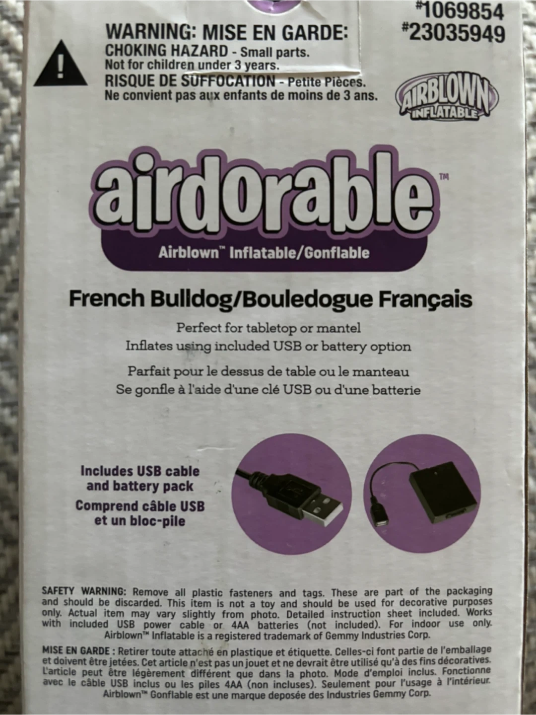 Get ready for Halloween with this adorable Airdorable French Bulldog inflatable! It's brand new in the box and ready to bring some spooky fun to your tabletop or mantel. It inflates using either a USB cable or a battery pack, both of which are included. It measures 19.7 inches (50 cm) tall, making it the perfect size for indoor use