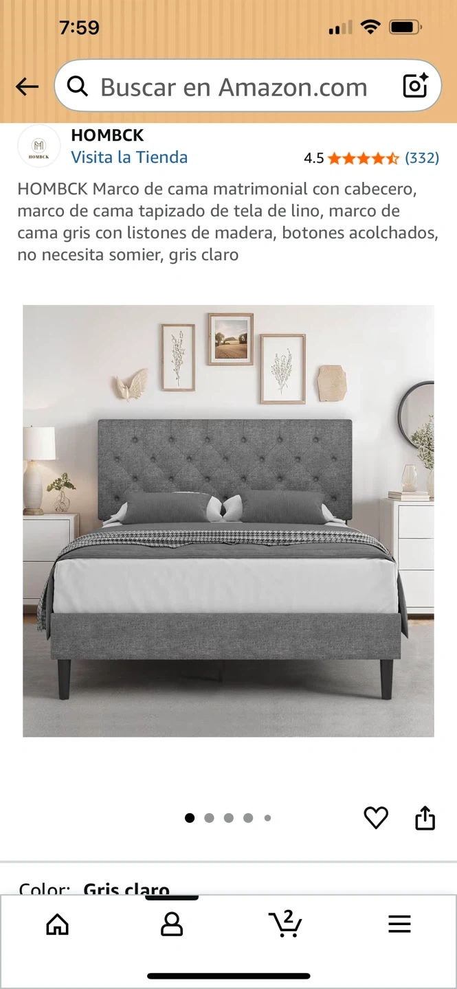 Selling a HOMBCK full-size bed frame with a headboard. It features a linen fabric upholstery, a light gray color, wooden slats, and button-tufted detailing. It does not require a box spring