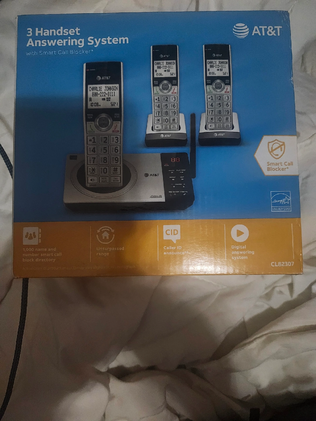 Selling an AT&T 3 Handset Answering System with Smart Call Blocker. It includes features like Caller ID announce and a digital answering system. It can store 1,000 name and number smart call block directory and has unsurpassed range. Model number CL82307