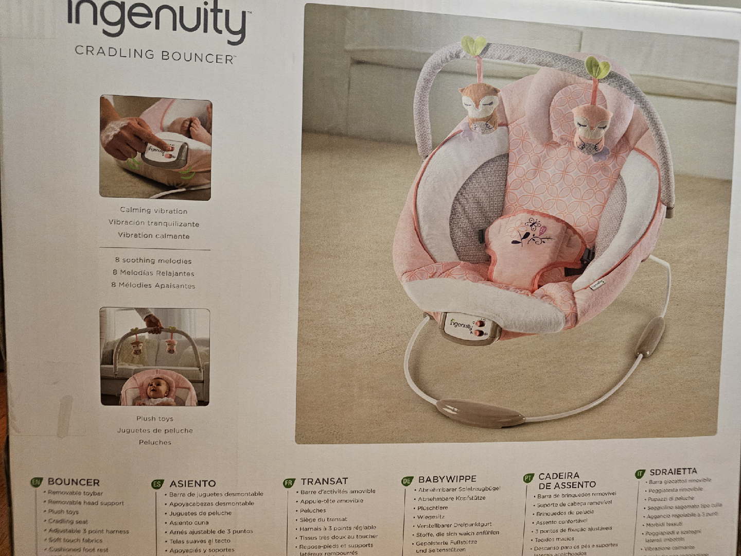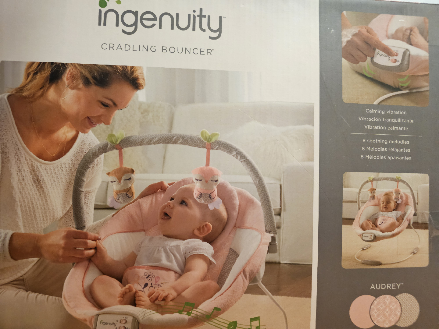 open box but brand new, $70 obo - Selling an Ingenuity Audrey cradling bouncer in pink! It features calming vibrations and 8 soothing melodies to help your little one relax. The bouncer also includes plush toys for added entertainment and a removable headrest for comfort.