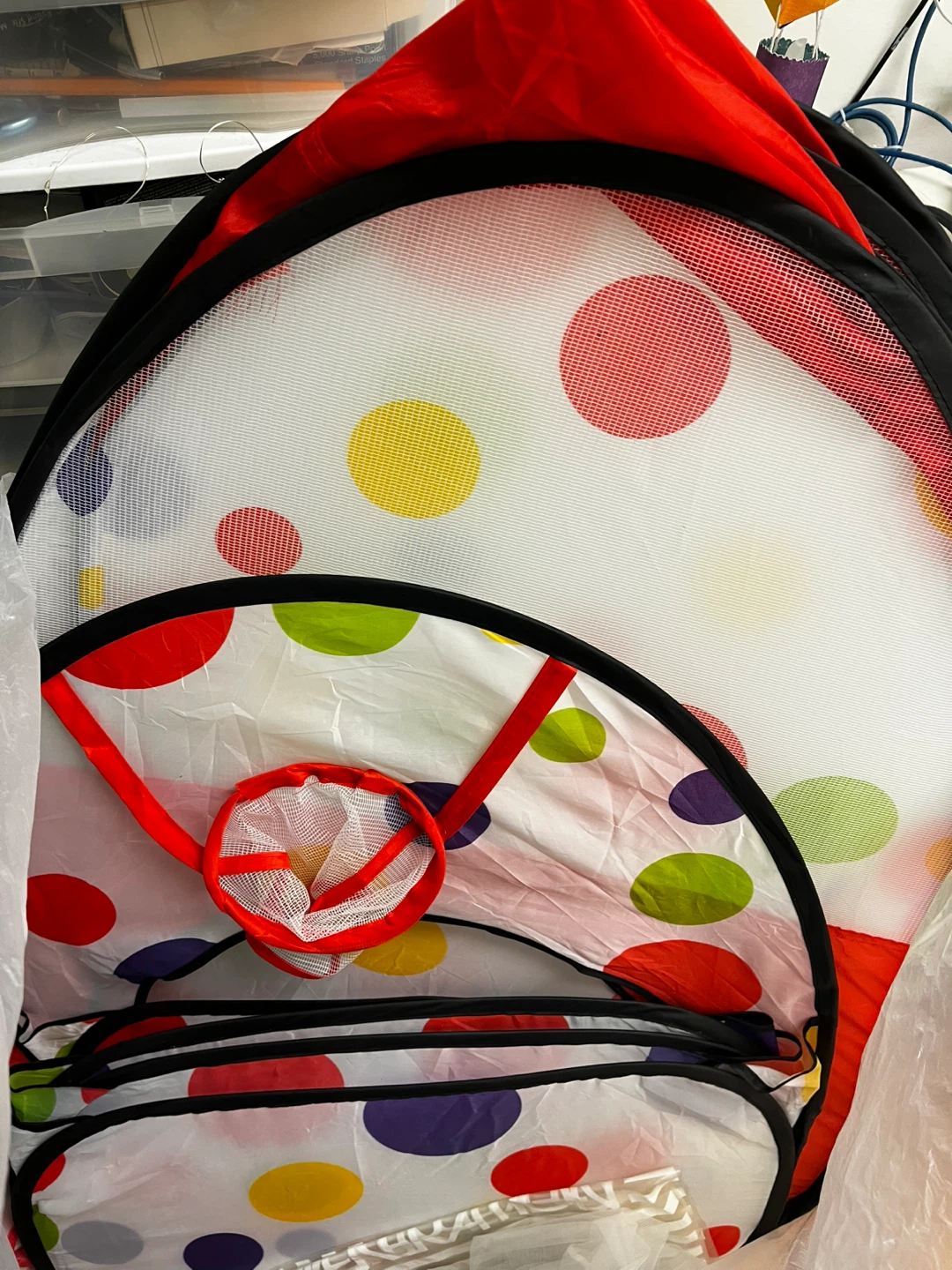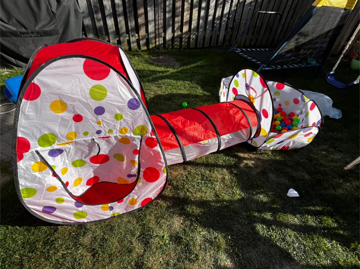 Selling a fun play tent for kids! It features a tunnel and a ball pi with a small basketball hoop, perfect for hours of entertainment. The tent is white with colourful polka dots and red accents. Great for indoor or outdoor play! Comes in 3 pieces that can be combined together to make one big fun place.