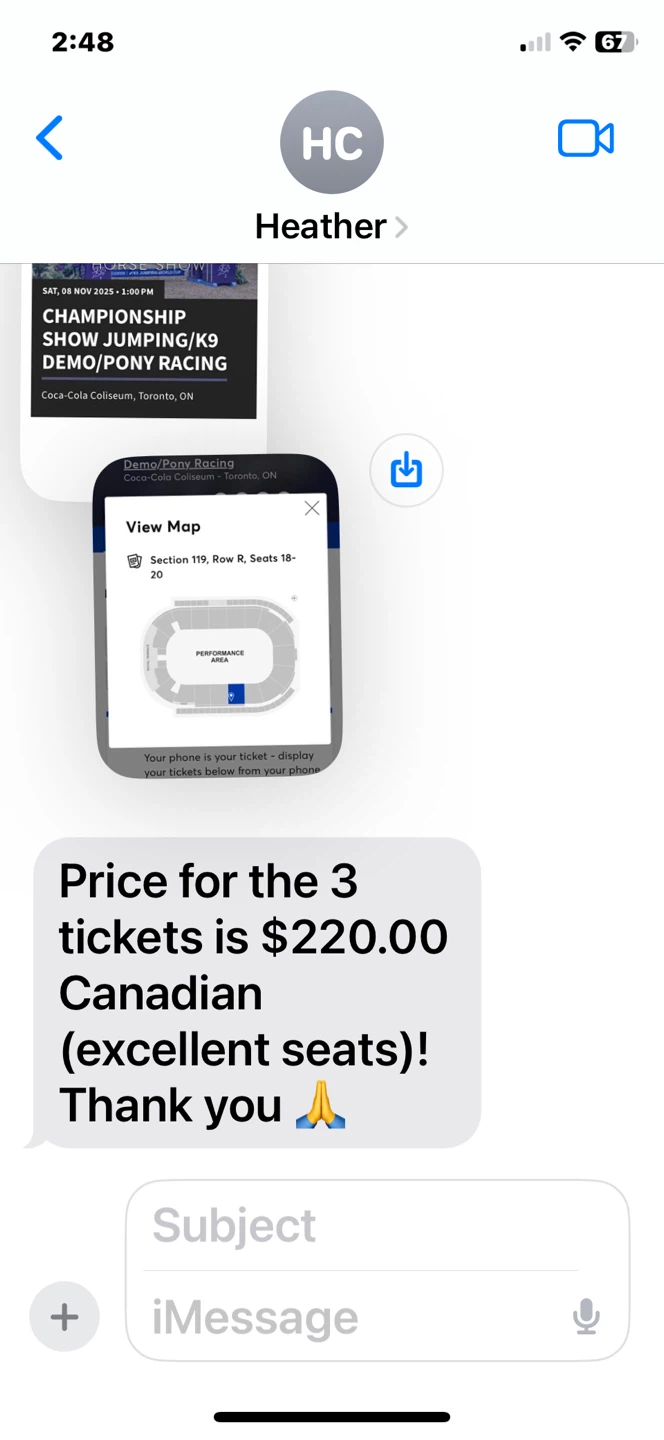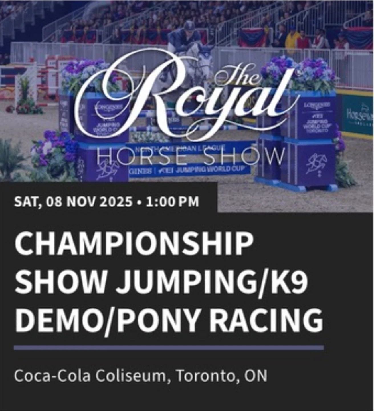 Selling three tickets to The Royal Horse Show on Saturday, November 8, 2025 at 1:00 PM. The event is Championship Show Jumping/K9 Demo/Pony Racing at the Coca-Cola Coliseum in Toronto. Excellent seats!