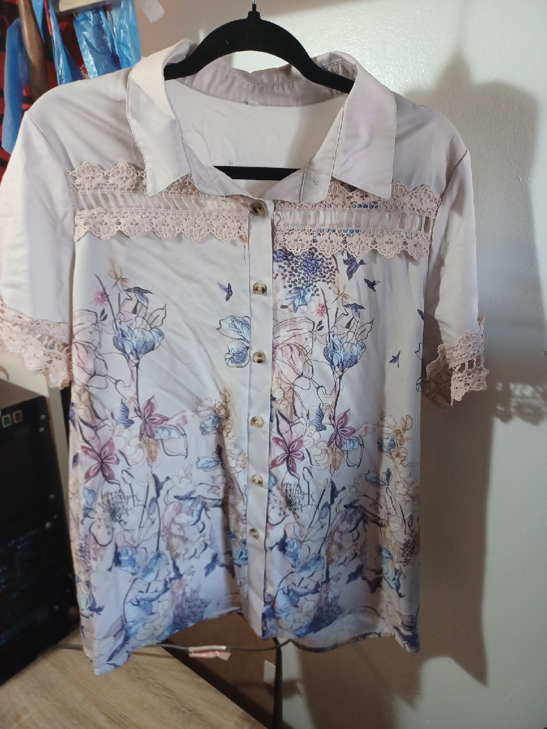 Here's a cute blouse with a floral print and delicate lace trim! It's perfect for adding a touch of whimsy to your wardrobe. The soft colours and unique design make it a standout piece