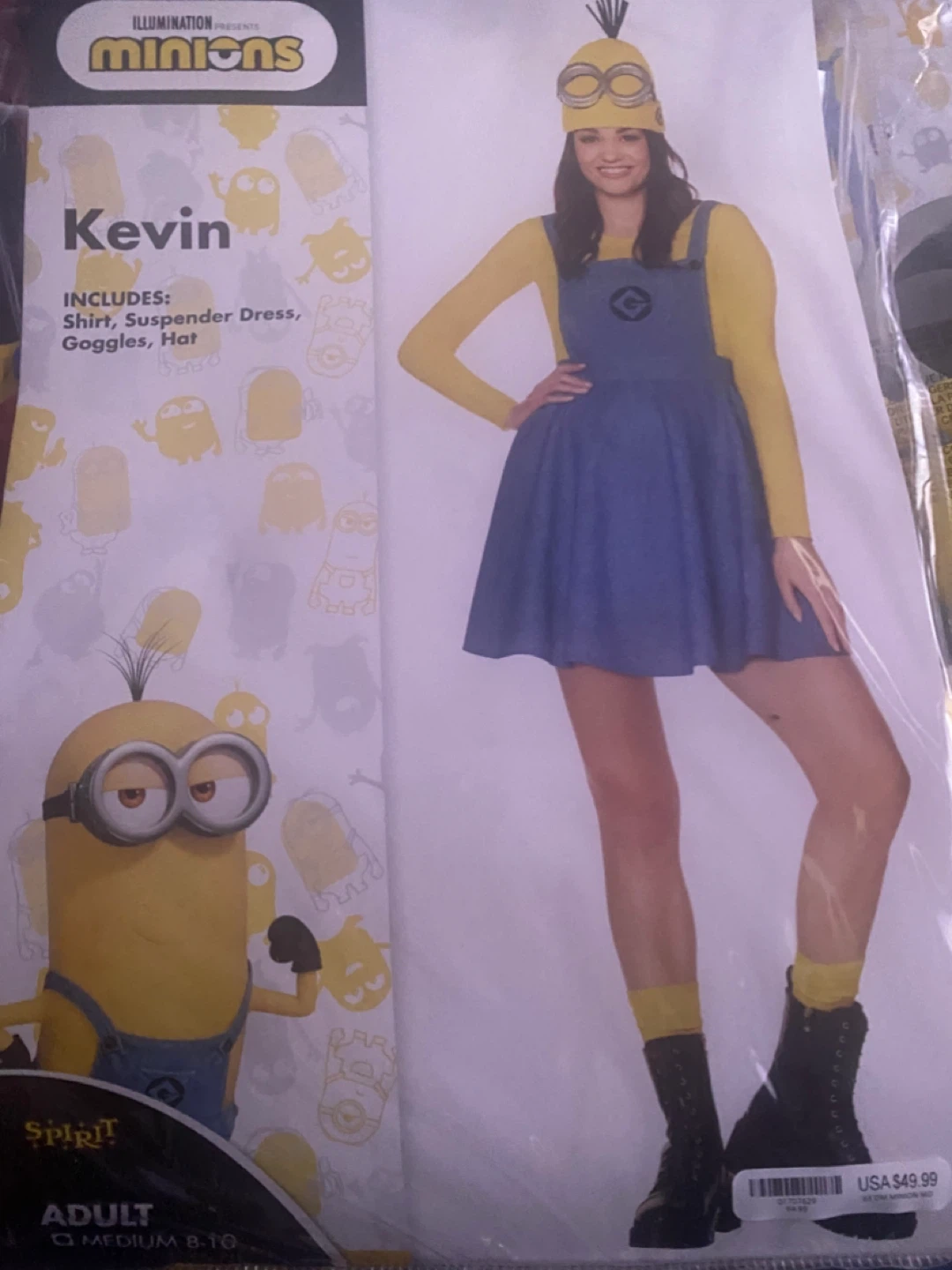 Selling a Minions Kevin costume for adults Women, size medium (8-10)! The costume includes the shirt, suspender dress, goggles, and hat. Originally bought for $49.99.