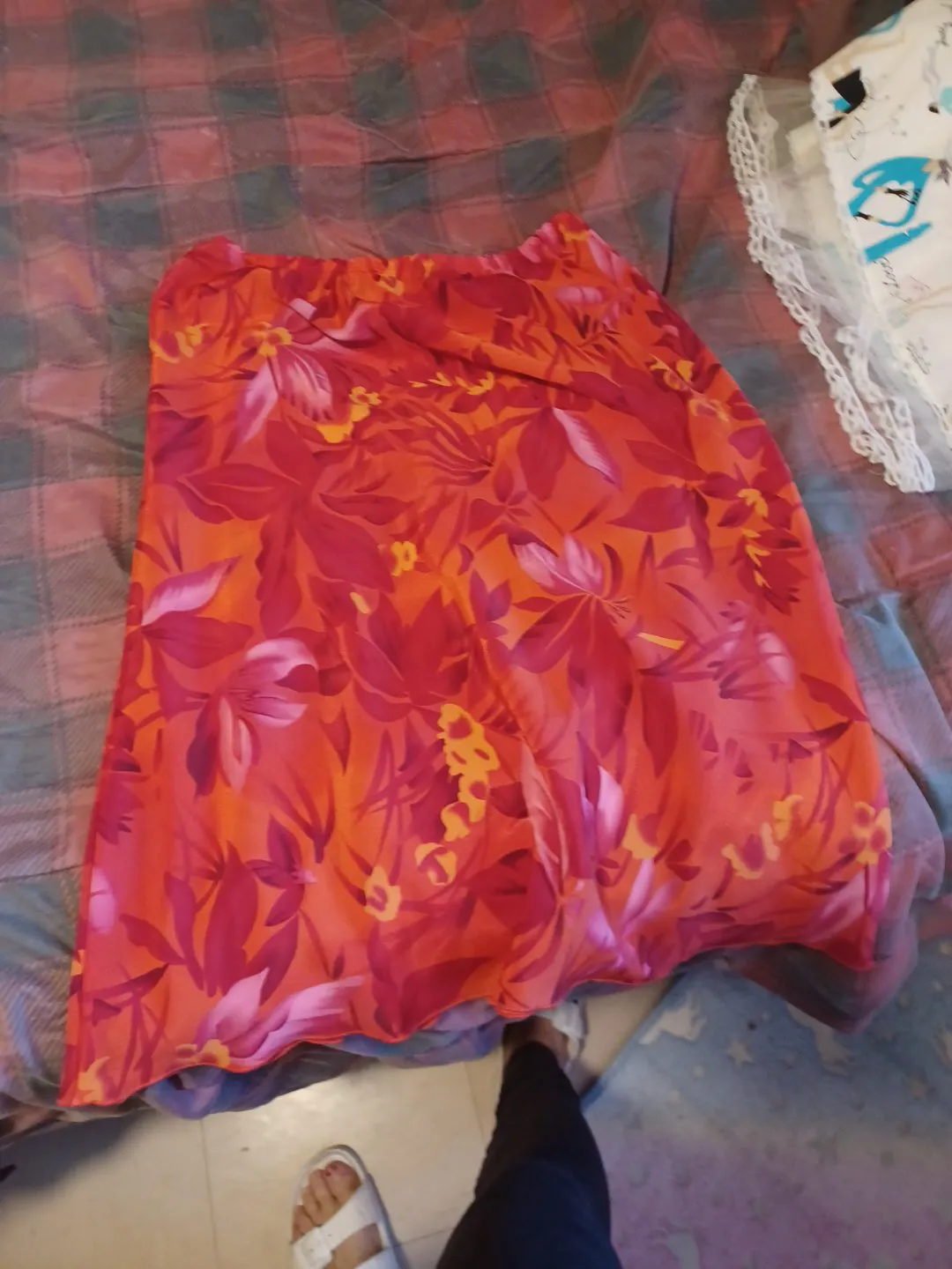 Here's a cute skirt with a vibrant floral print! The colours are a mix of orange and pink, perfect for adding a pop of colour to your wardrobe! It's in great condition and ready for a new home
