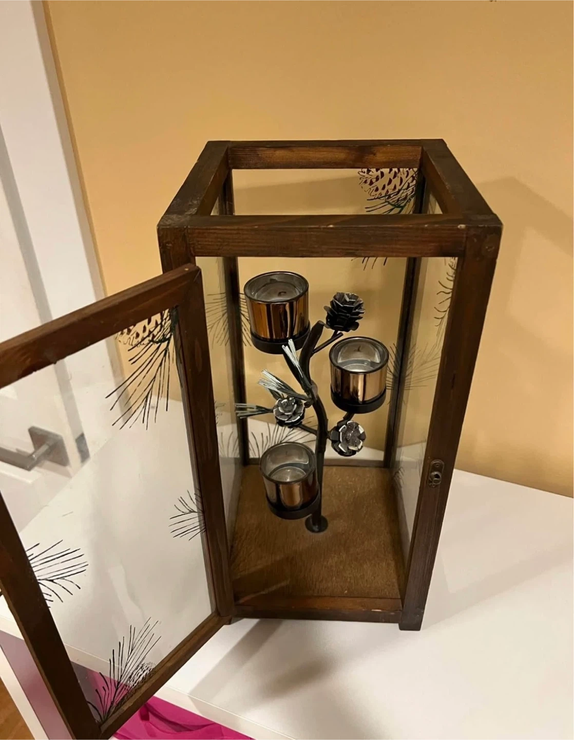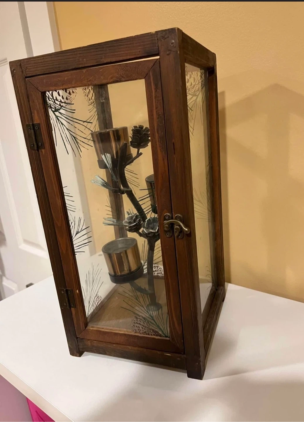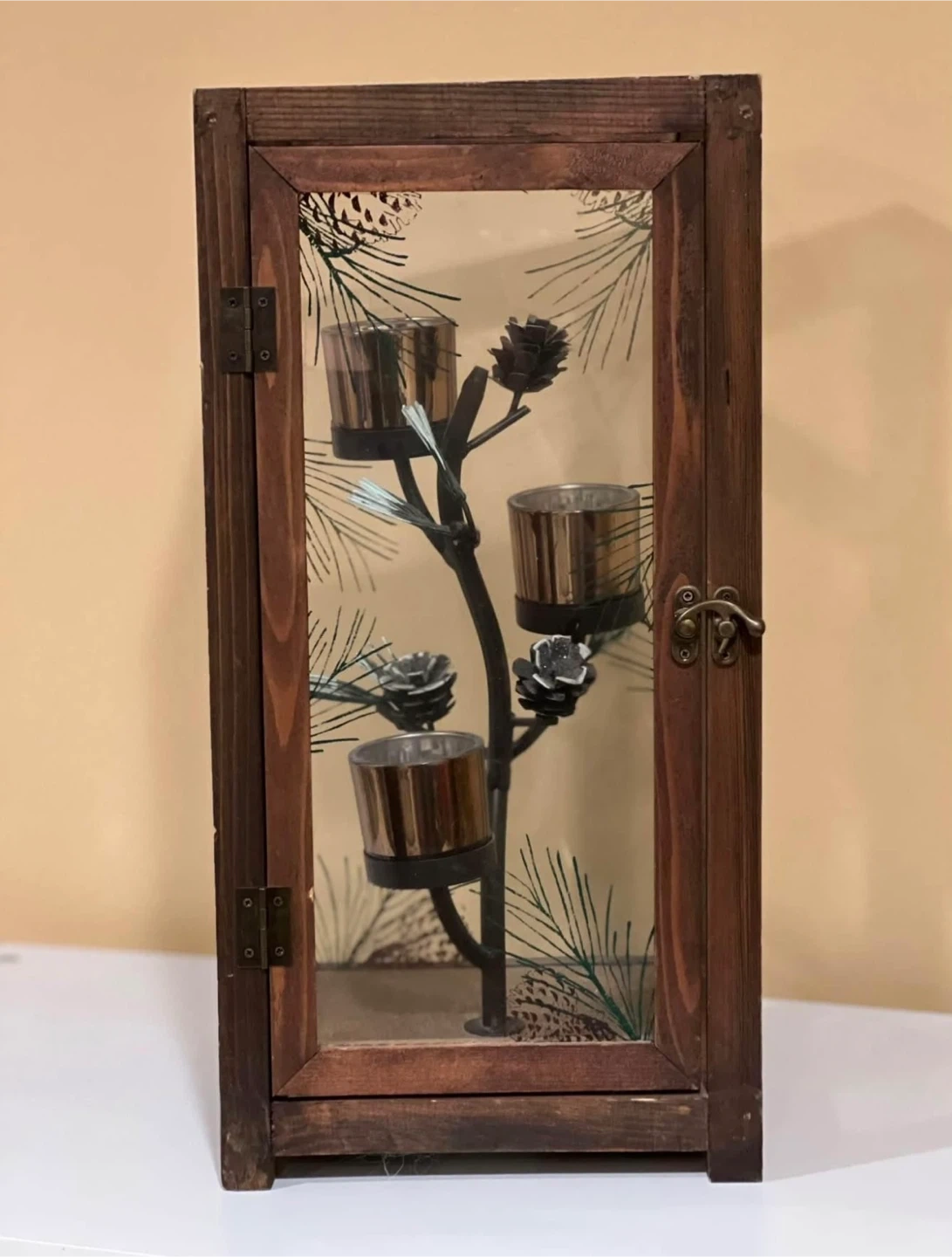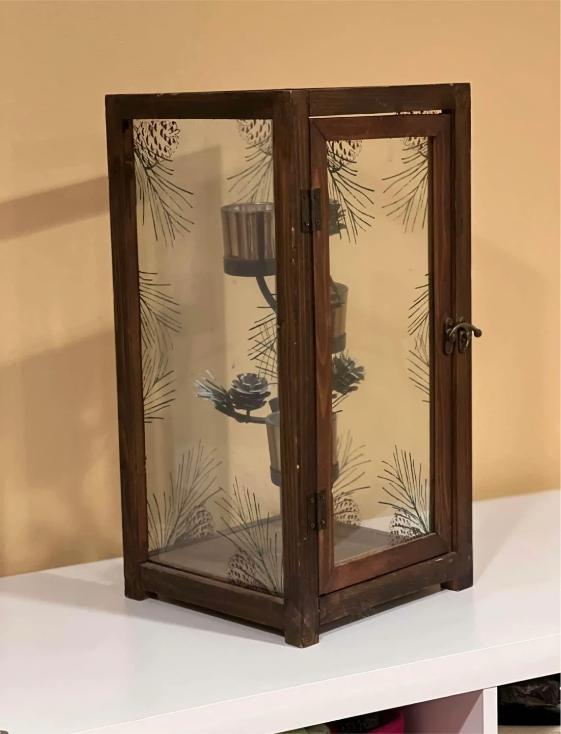 This is a charming wooden candle lantern with a rustic design. It features glass panels adorned with a delicate pinecone pattern. The lantern has a hinged door with a latch, making it easy to place and remove candles. A lovely addition to any home decor!