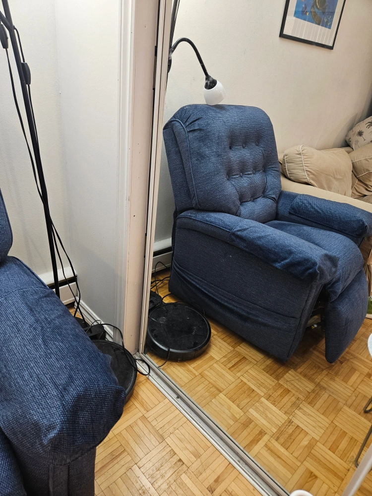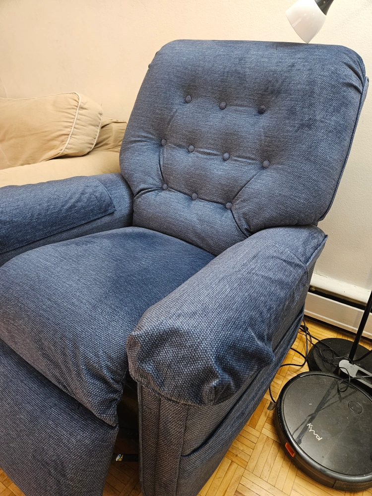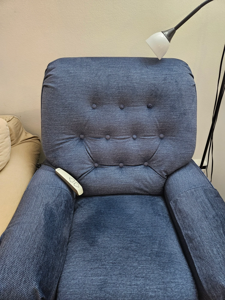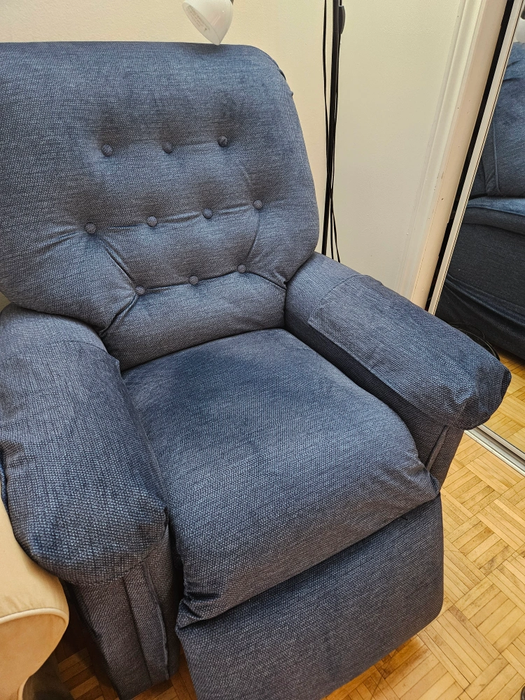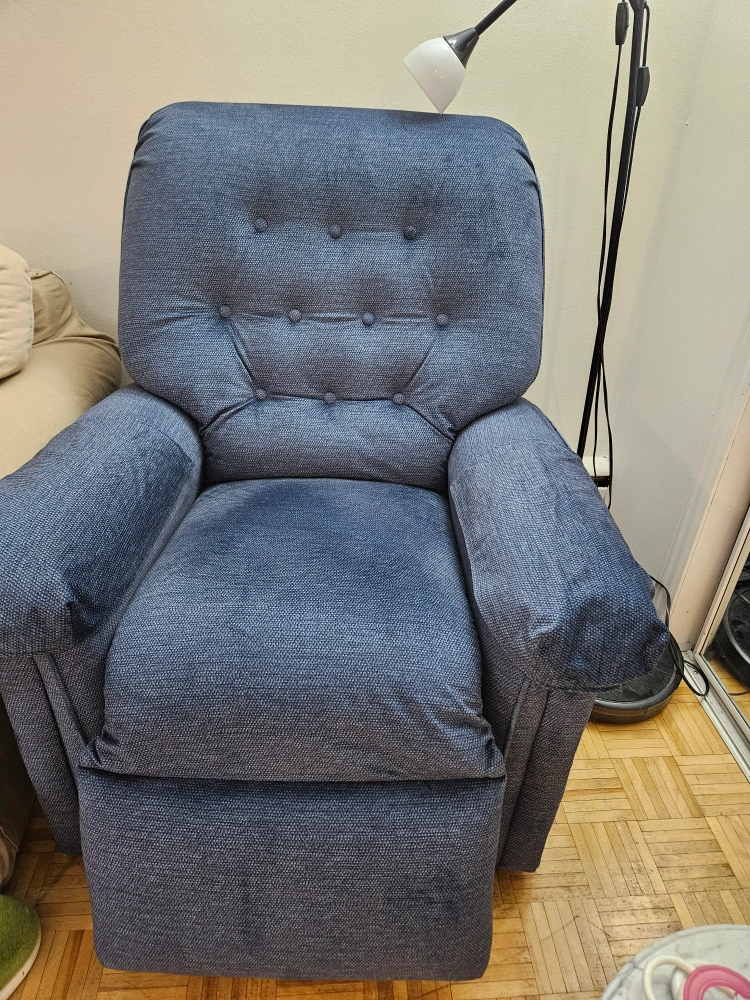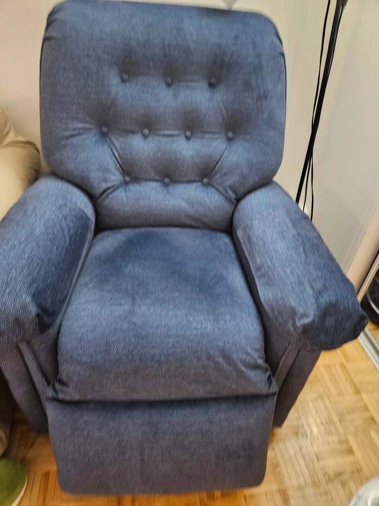 in prestine condition Comfortable blue recliner chair in good condition. Perfect for relaxing after a long day! The fabric is soft and durable, and the chair reclines smoothly. It's a great addition to any living room or den