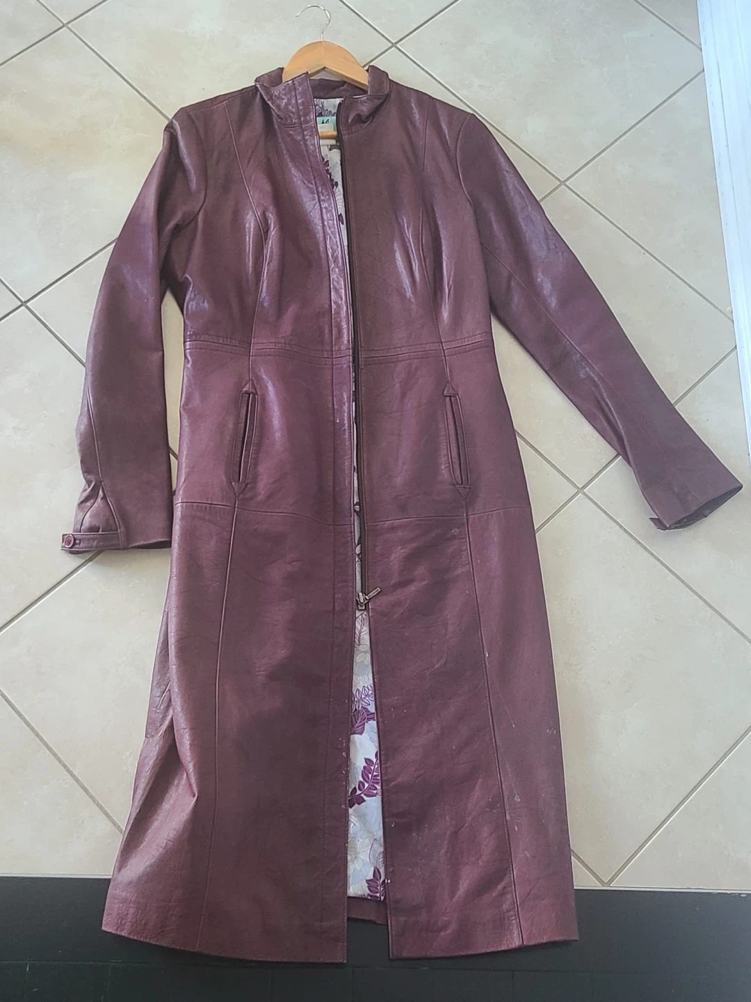 Beautiful Marciano leather coat in a lovely burgundy colour. It's a size medium and has a unique floral lining. Perfect for adding a touch of sophistication to your wardrobe!