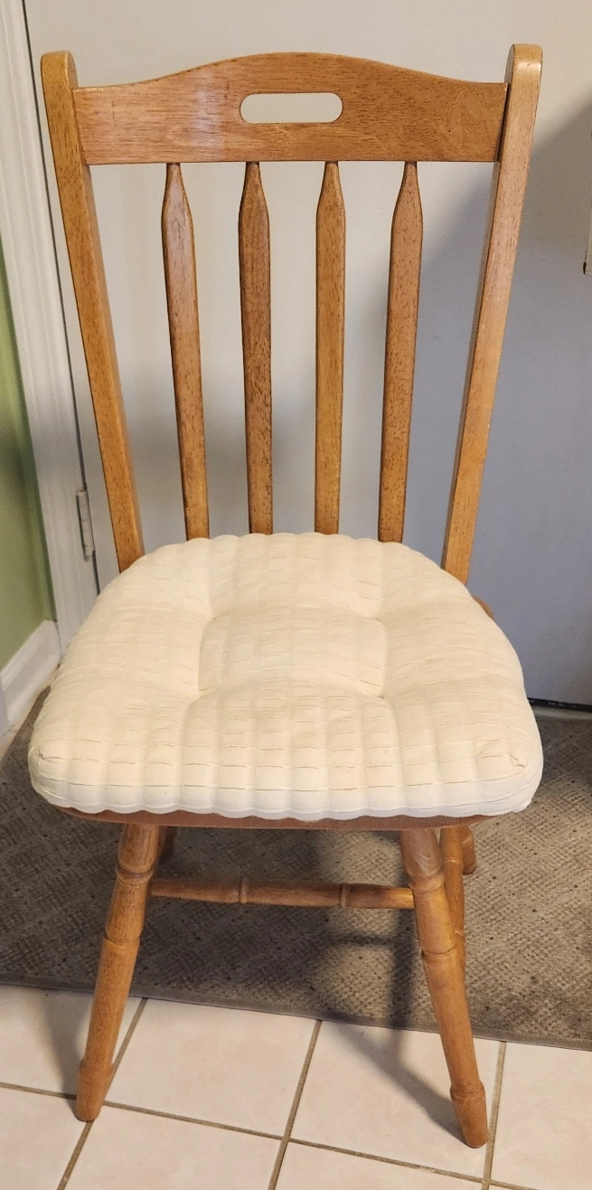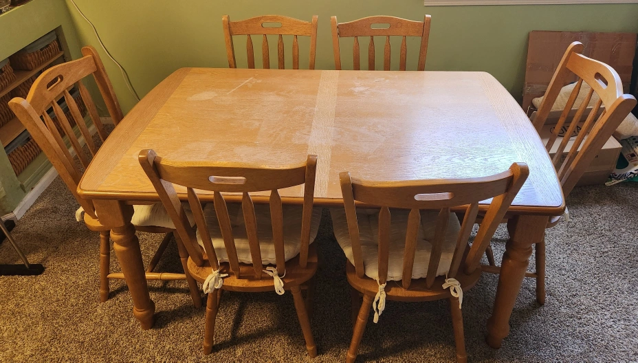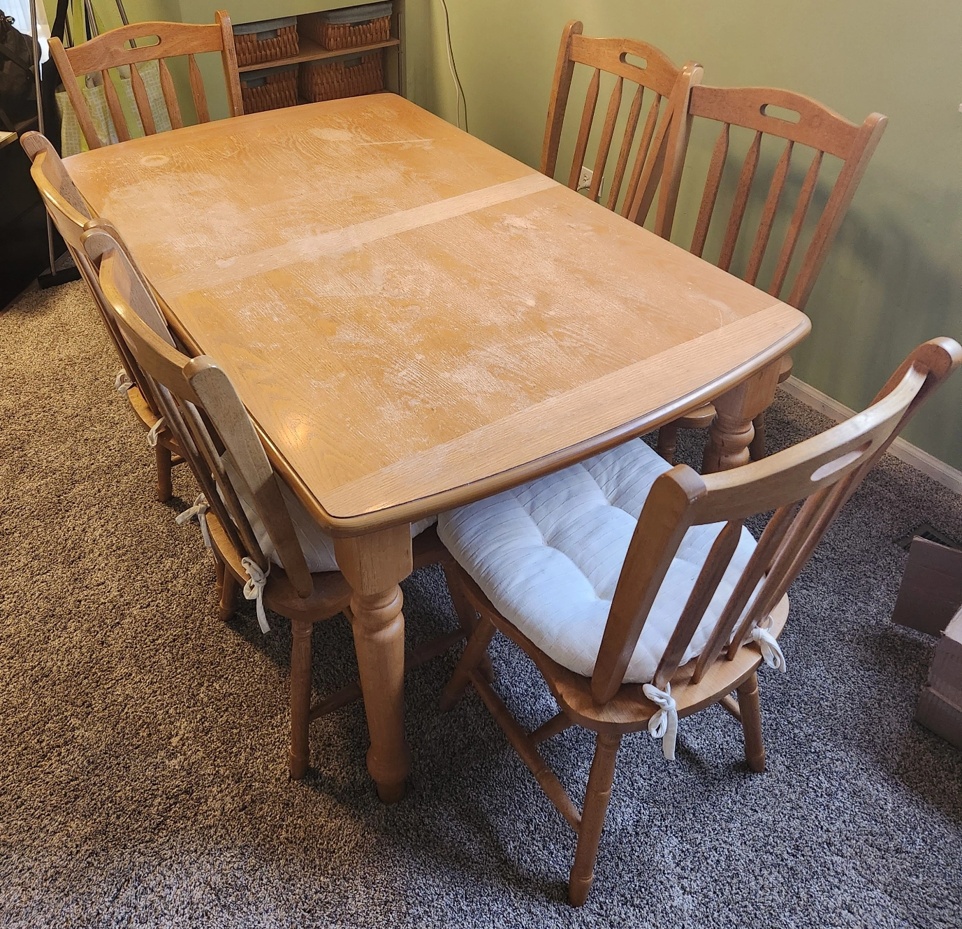 Wooden dining table that comes with six chairs. The set has a classic, sturdy design. Perfect for family meals or gatherings! The chairs have padded cushions for extra comfort. Table legs can be removed for transport. Pick-up only.
