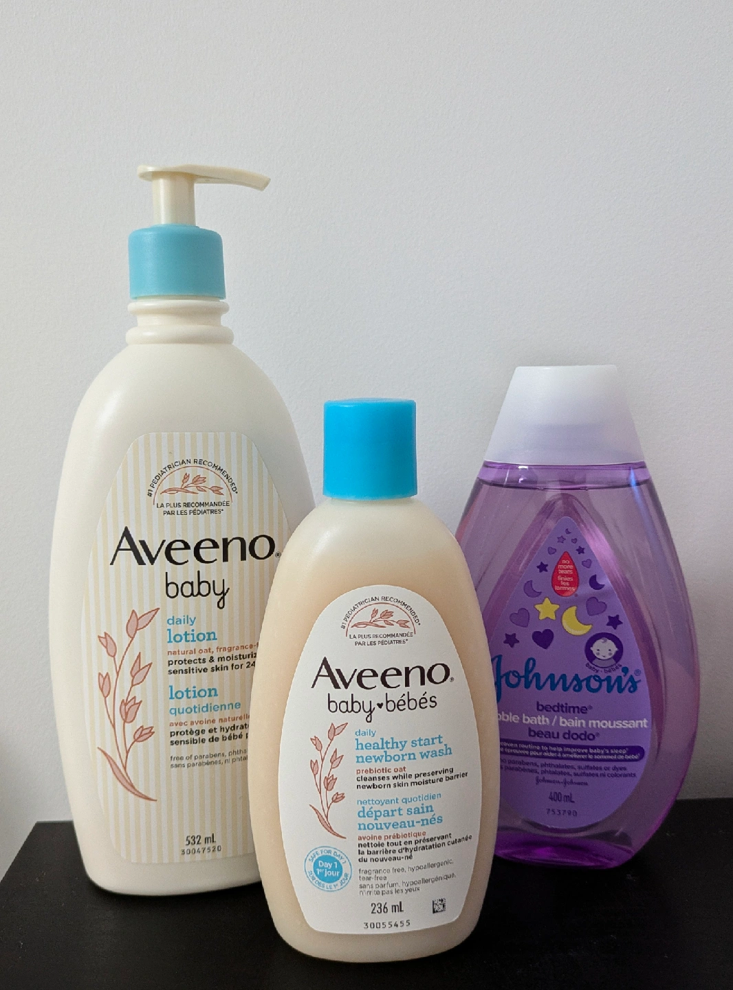Selling a set of baby bath products! This includes a bottle of Aveeno Baby Daily Lotion (532 ml), Aveeno Baby Healthy Start Newborn Wash (236 ml), and Johnson's Bedtime Bubble Bath (400 ml)