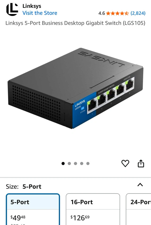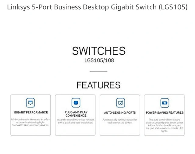 This is a used Linksys 5-Port Business Desktop Gigabit Switch (LGS105), perfect for expanding your network connectivity with gigabit speeds. This switch delivers reliable performance and seamless network integration, making it ideal for small businesses or home offices needing fast and efficient data transfer. It's in good working condition and ready to plug in and play! Key Features: * 5 Gigabit Ethernet ports for high-speed connections * Plug-and-play installation—no configuration required * Compact design for desktop or wall mounting * Energy-efficient technology for lower power consumption