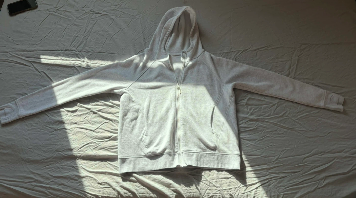 Selling a comfy light grey zip-up hoodie! It's in great condition and perfect for layering or wearing on its own. It features a full zip, a hood, and pockets. Would be great for running or just lounging around