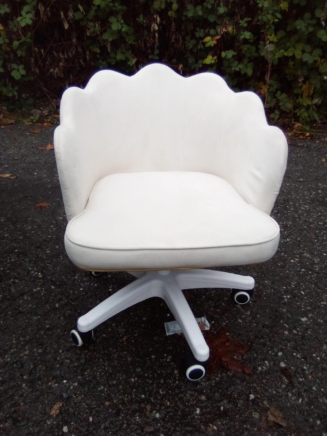 Selling a cute white scalloped swivel desk chair! Adjustable height. It's in good condition. Recently steam cleaned. Asking $25