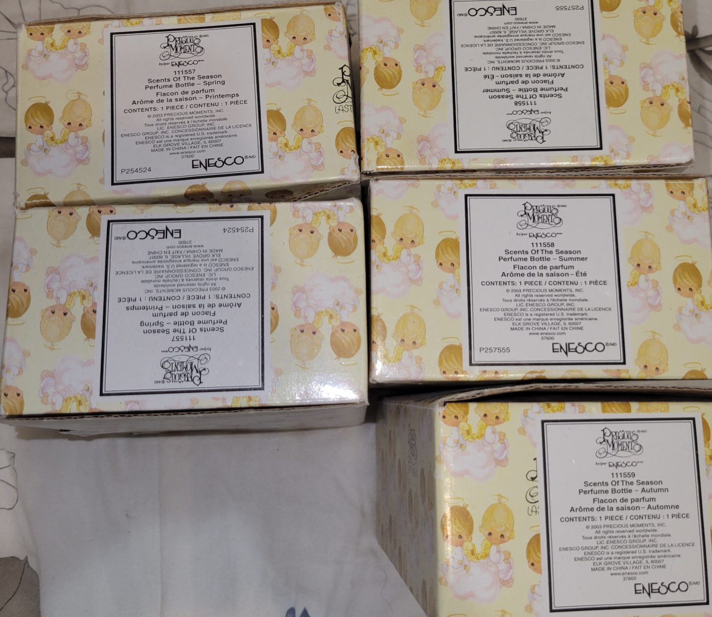 These are Precious Moments Scents of the Season perfume bottles. They are for decorative purposes only and come in their original boxes. Each box contains one piece/content. Perfect for collectors! 5 in total. $15 each