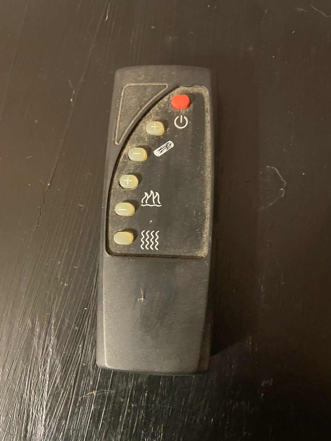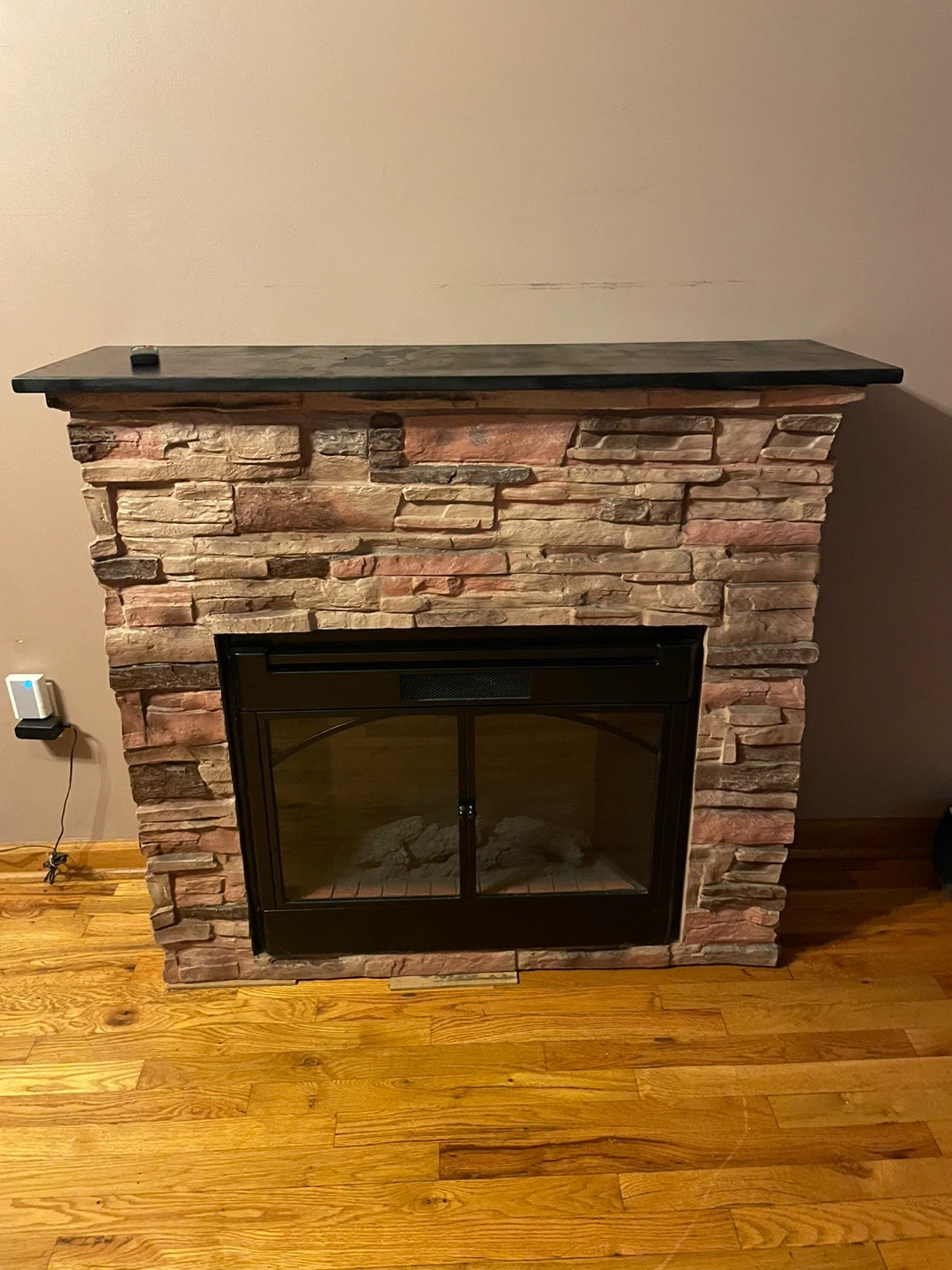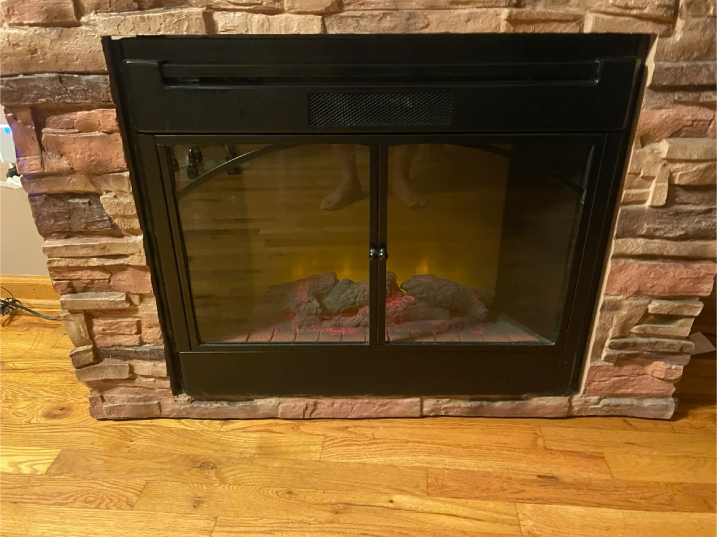 Selling an electric fireplace featuring a realistic faux stone surround. It has a black frame around the glass doors and a black top. The electric fireplace provides a cozy ambiance with its simulated flames and glowing embers. It's in good condition and ready to add warmth and charm to your space