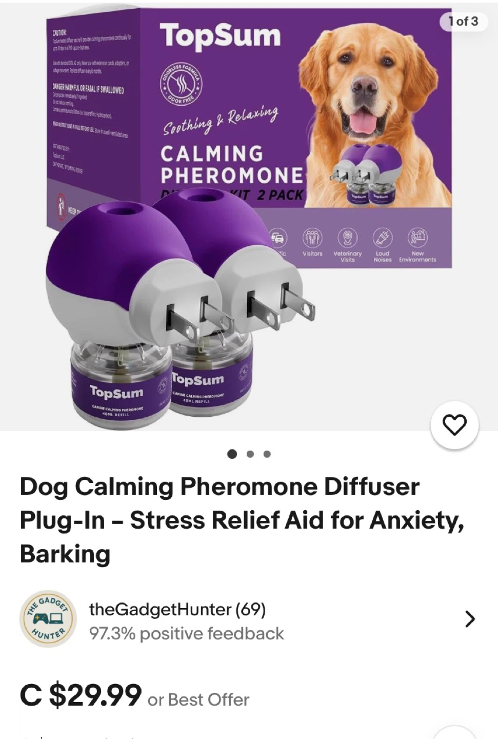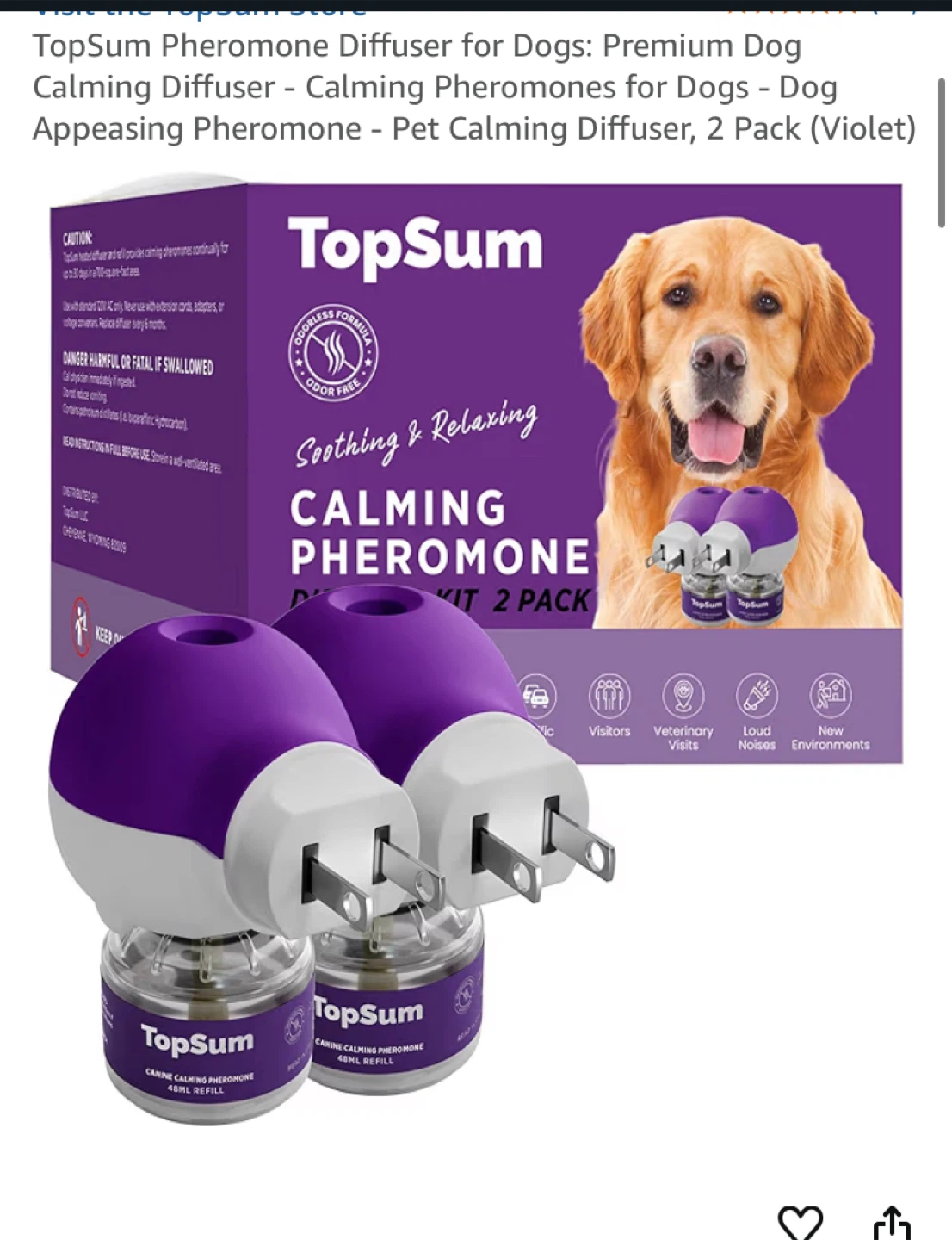 I'm selling a TopSum Calming Pheromone Diffuser Kit for dogs! This is a complete starter kit that includes 2 packs of diffuser heads and 2 packs of 48mL calming vials, providing approximately 60 days of continuous use. It helps ease common signs of discomfort in dogs, targeting triggers like visitors, loud noises, and conflicts between dogs due to environmental changes. Designed to effectively cover large areas up to 700 square feet, this diffuser works best when placed in a location where your dog spends the most time. It's formulated with pet-friendly ingredients, offering a drug-free way to help comfort dogs by mimicking a natural nursing pheromone to create a comforting environment at home