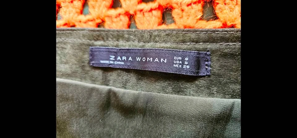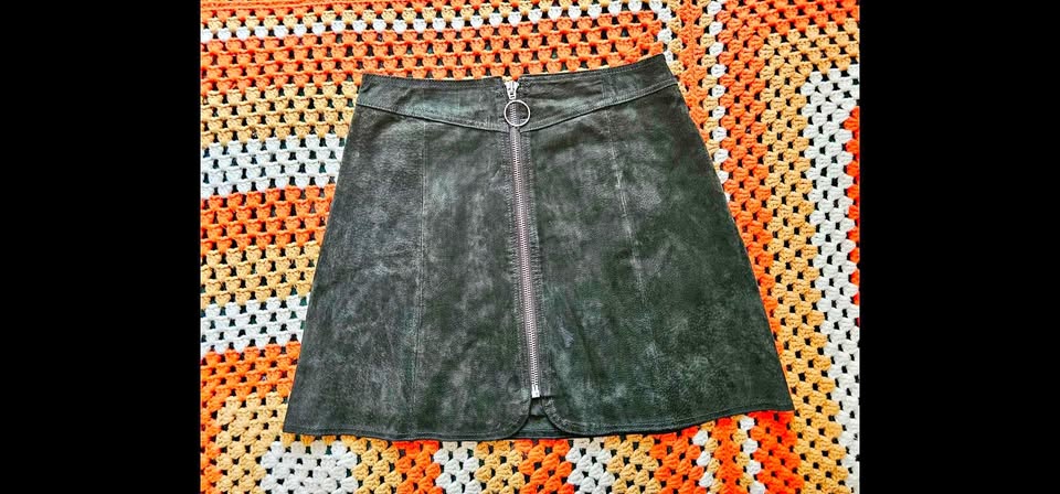 Cute 70s-inspired genuine suede miniskirt from Zara, in a dark olive green color. Skirt closes with a full-length silver tone zipper and is lined with a poly lining. Pair with tall boots for a perfect retro autumn look!
