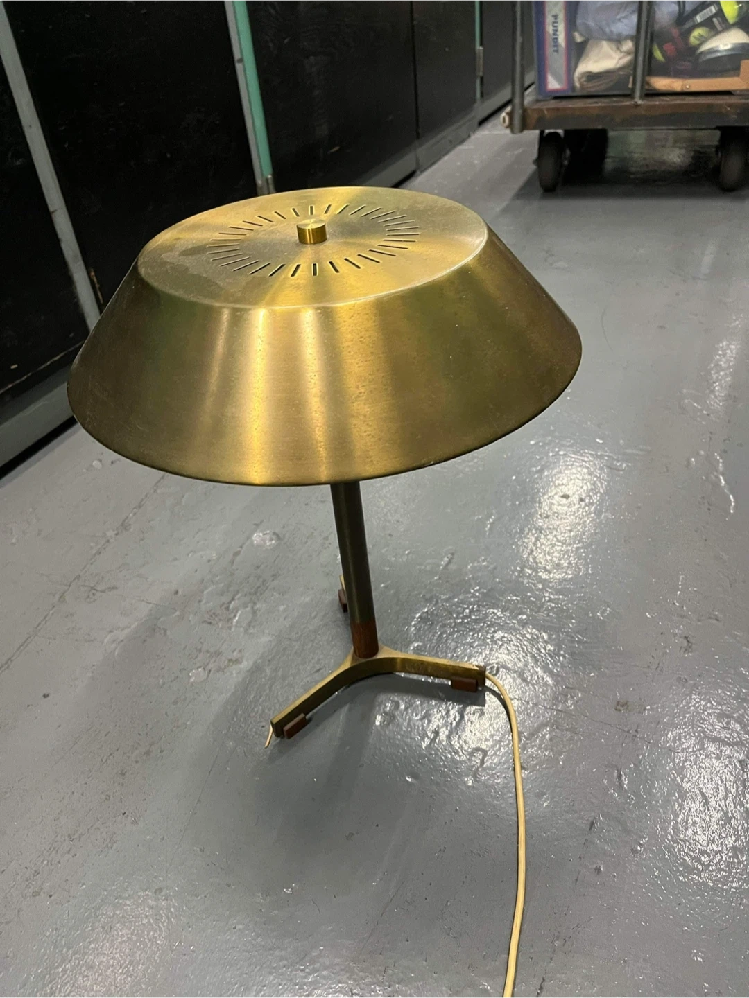 Selling original vintage Scandinavian table lamp (1950s/60s), in the style of Paavo Tynell / Hans-Agne Jakobsson. Features a perforated brass shade, teak wood accents, and a tripod brass base with wood feet. Dual bulb sockets provide soft, diffused light.