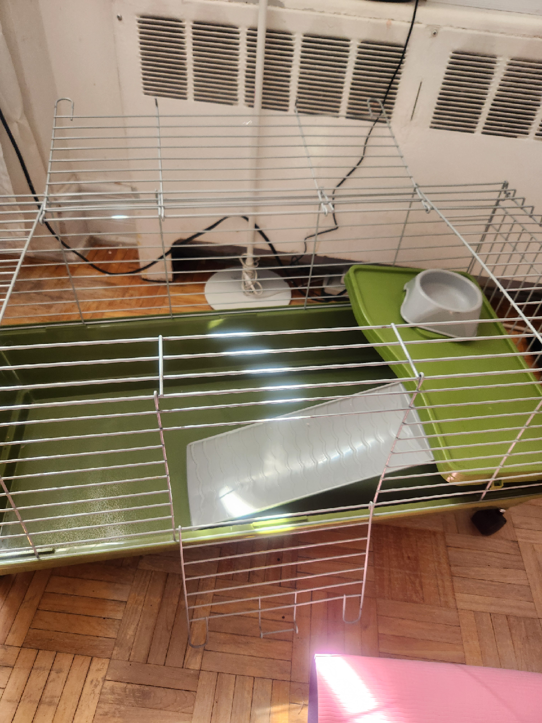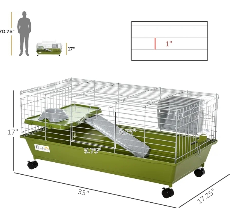 Selling a PawHut small animal cage! It's in great shape and ready for a new furry friend. The cage is 35 inches long, providing plenty of space for your pet to move around. It also comes with a food bowl, platform and ramp!