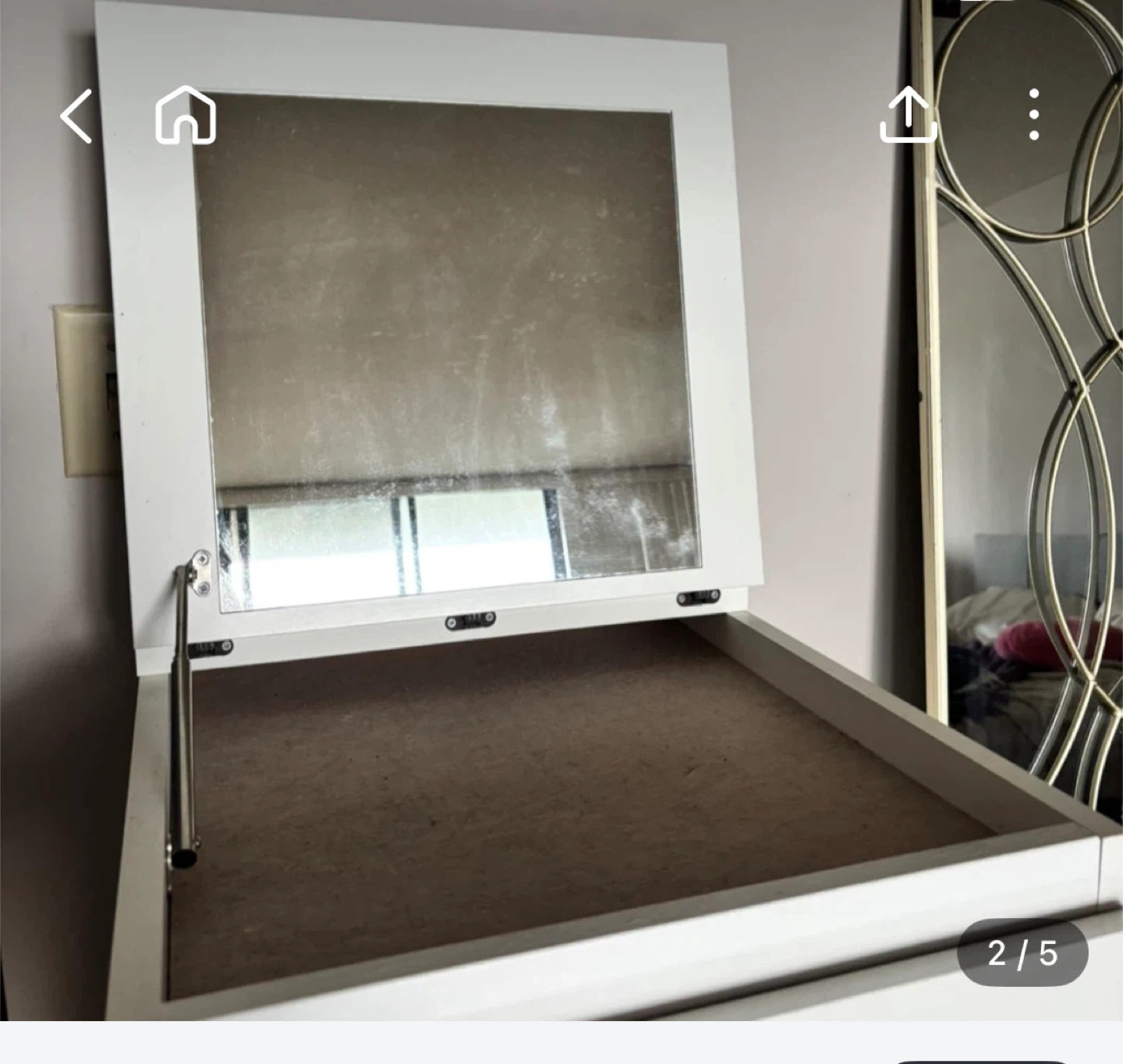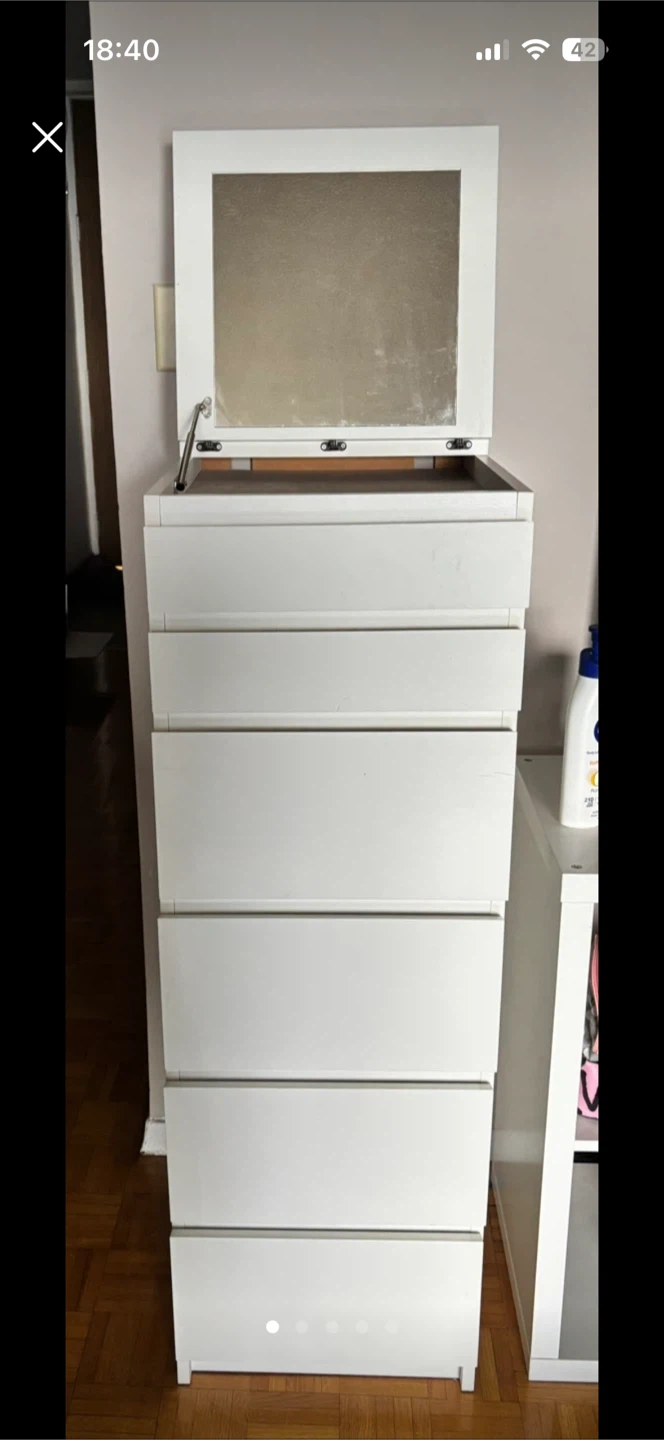 Selling a white vanity dresser with a mirror! It's got lots of storage space with 6 drawers. There are some signs of wear inside one of the drawers, see photo, but otherwise it's in good condition and ready for a new home!