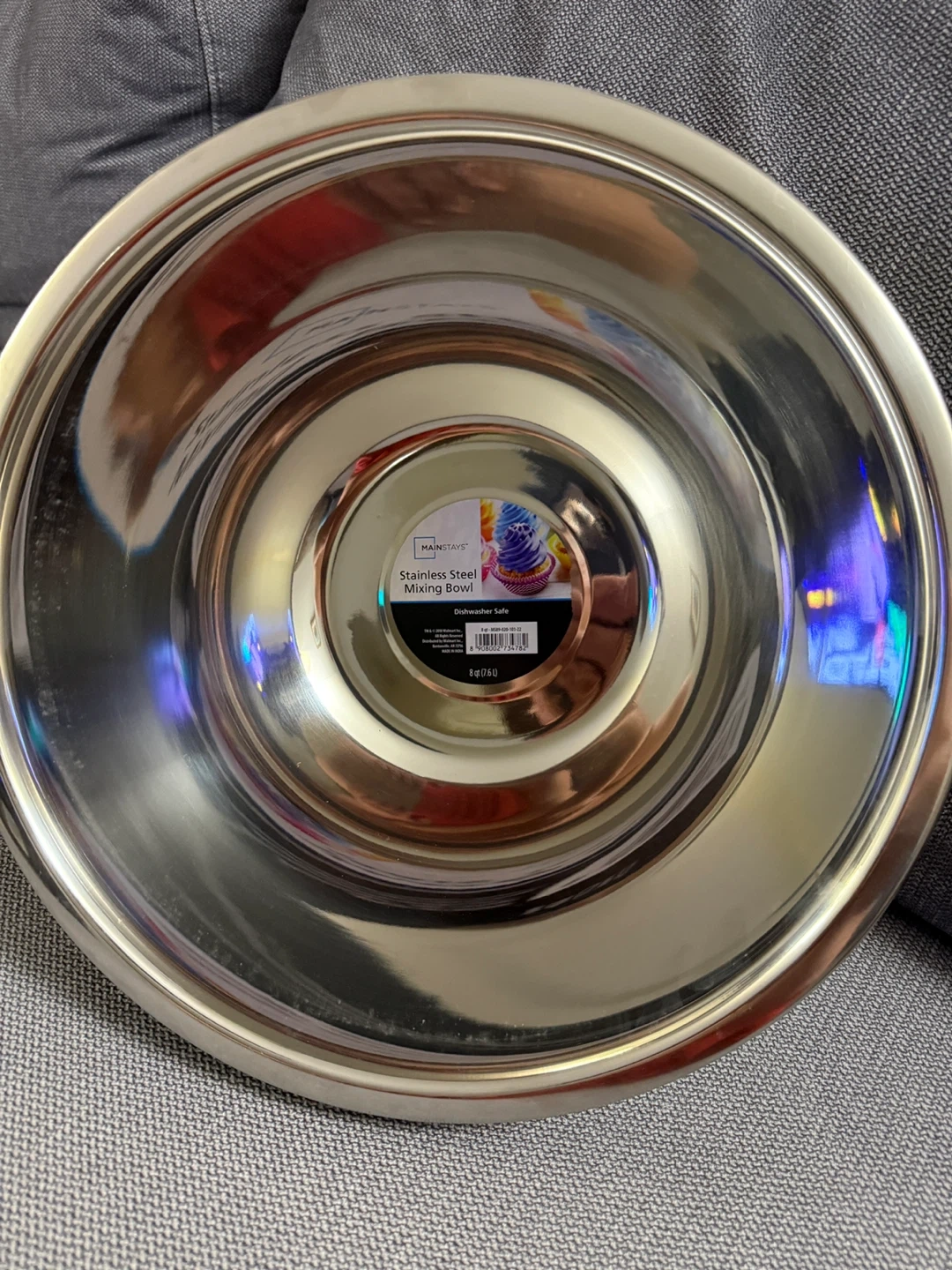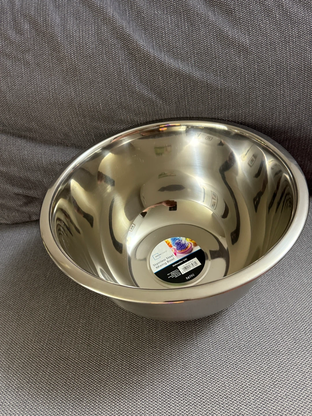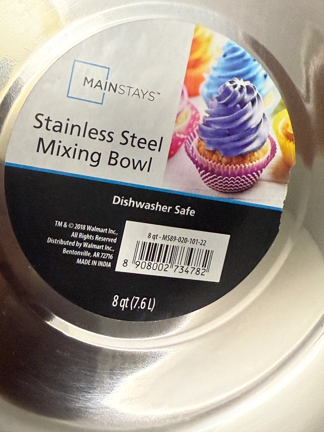 This is a Mainstays stainless steel mixing bowl. It's an 8 quart bowl, perfect for all your baking needs! It is also dishwasher safe