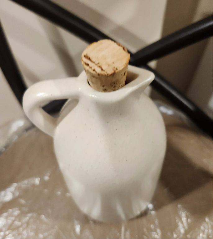 A beige stoneware oil bottle with a cork lid. The bottle is approximately 7 inches tall. It has a small spout and handle. There is a speckled texture on the bottle.