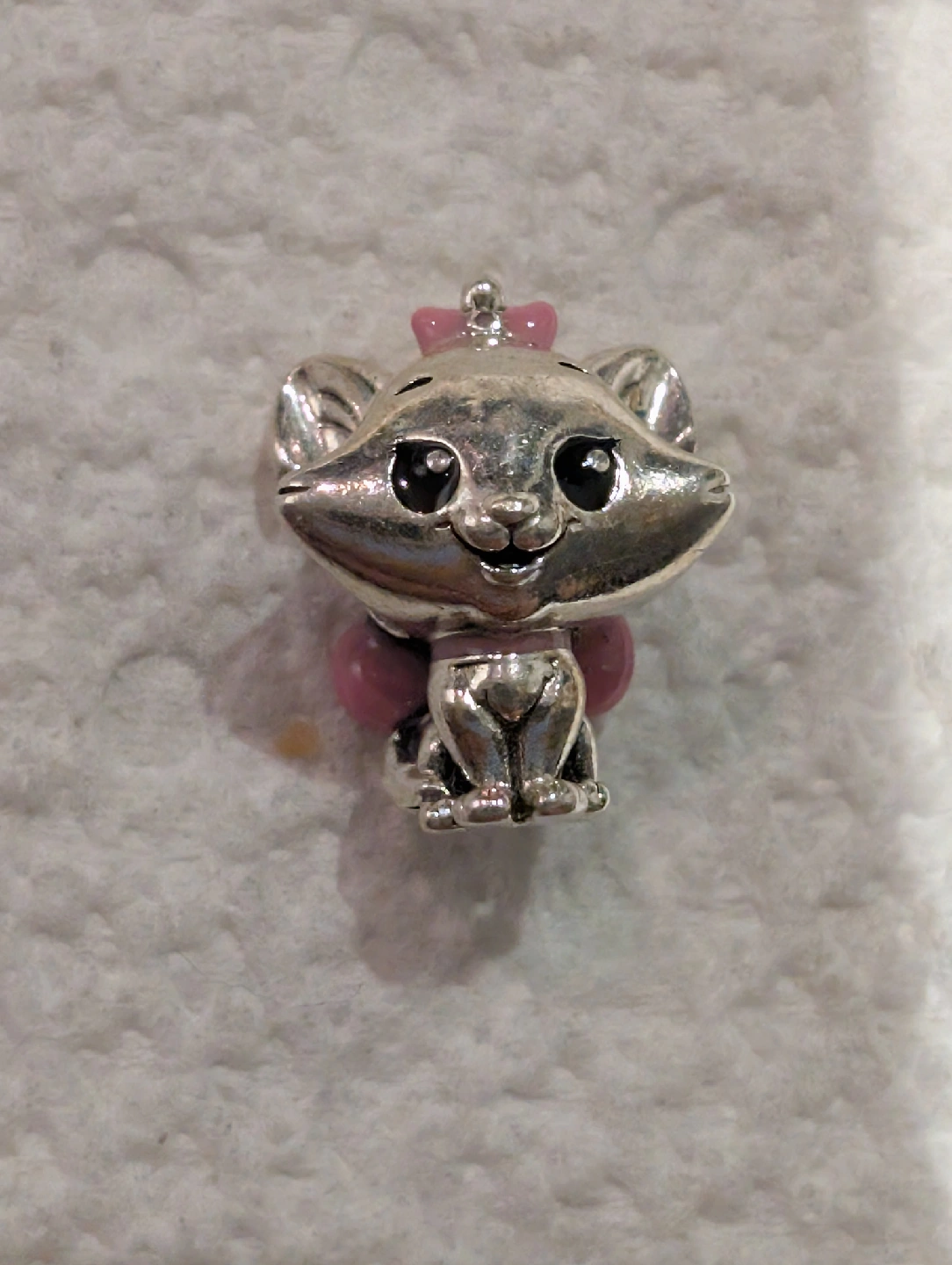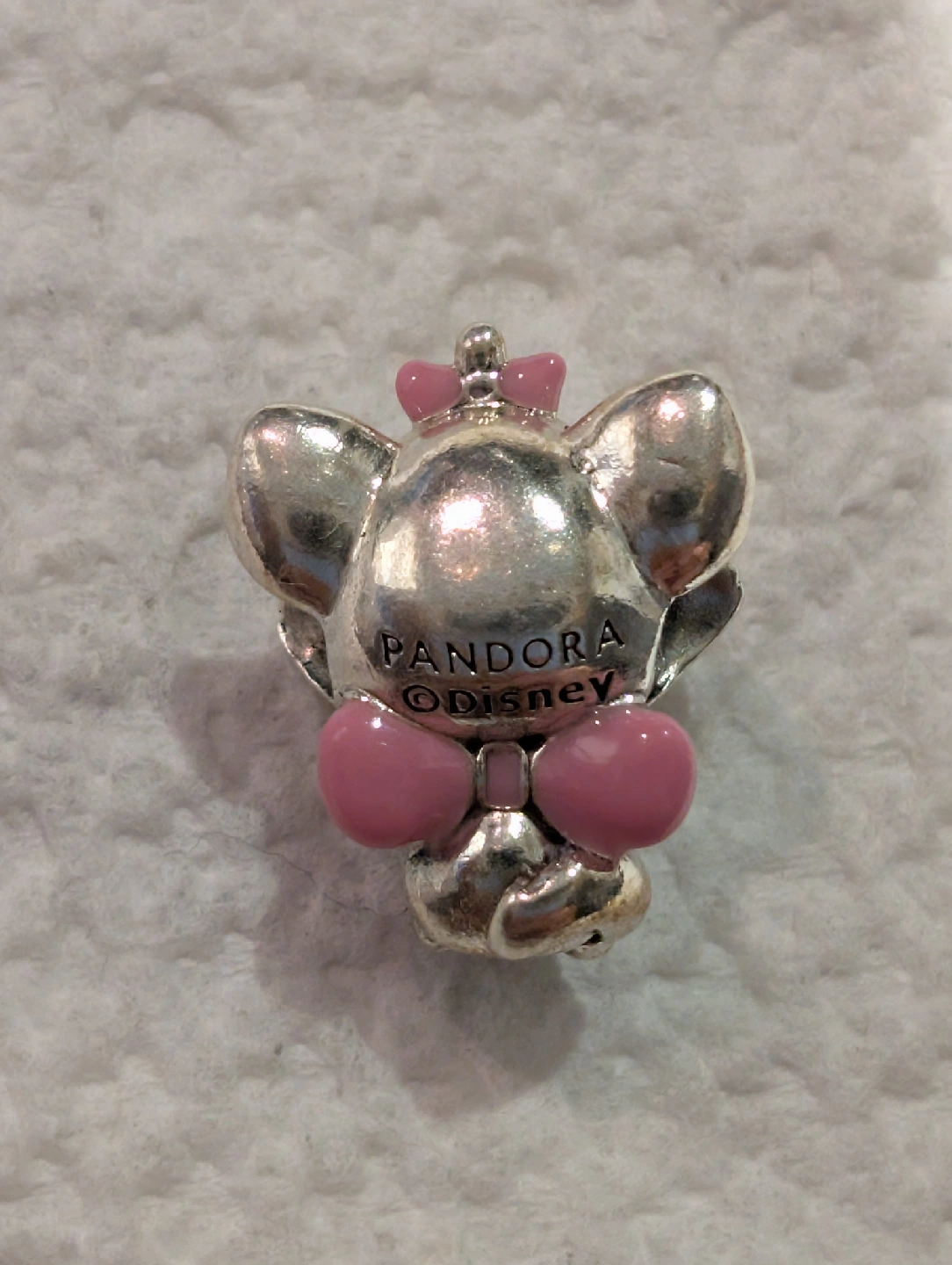 This is a Pandora Disney Aristocats Marie charm. It's in great condition and features Marie with her signature pink bow. The charm is 925 sterling silver pink enamel details. It's a cute addition to any Pandora bracelet!