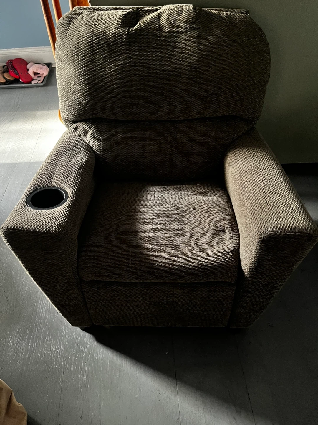 23Selling a comfy green recliner chair! It's perfect for relaxing and unwinding after a long day. The chair features a built-in cup holder, so you can keep your favorite beverage close at hand. It's in great condition and ready for a new home