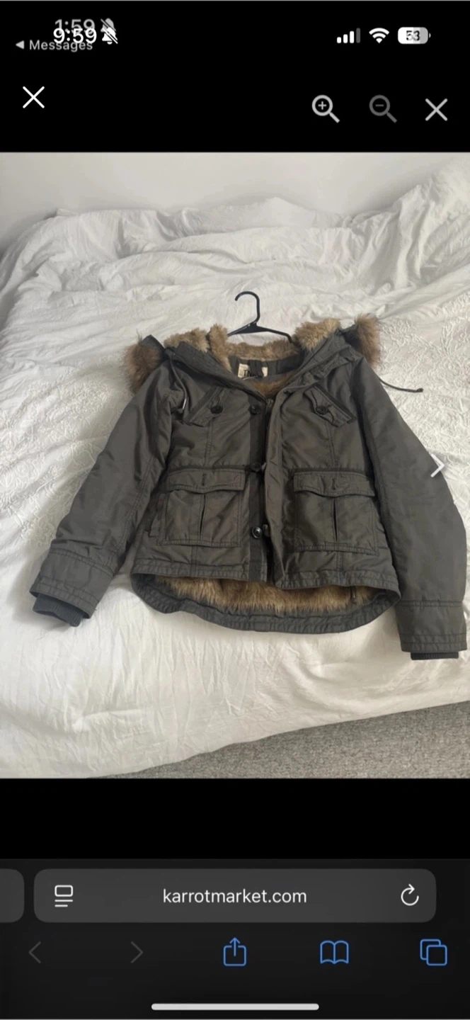 Selling a cute tna winter jacket in olive green! It's super warm and cozy, perfect for the colder weather. It has a faux fur trim on the hood and lining, adding a stylish touch pick up cash only.