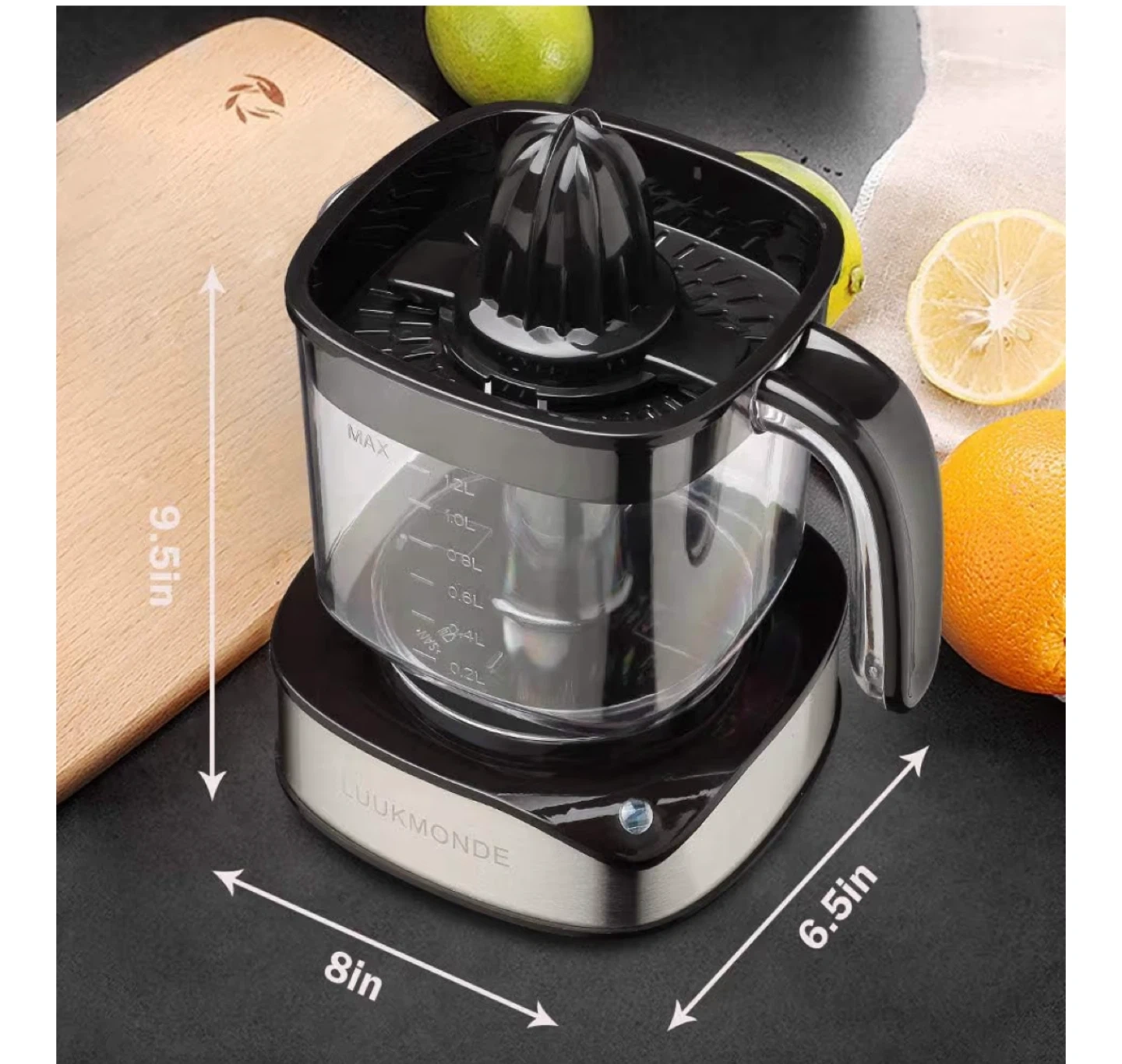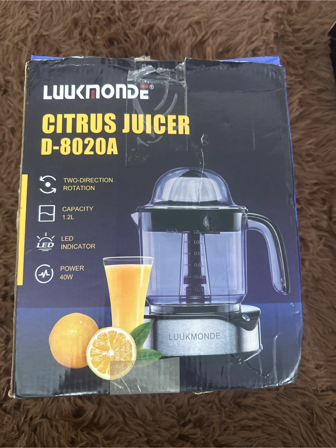 I'm selling a Luukmonde Citrus Juicer, model D-8020A. It's in great condition and comes with the box. It features two-direction rotation, a 1.2L capacity, an LED indicator, and 40W power. Dimensions are 9.5in x 8in x 6.5in