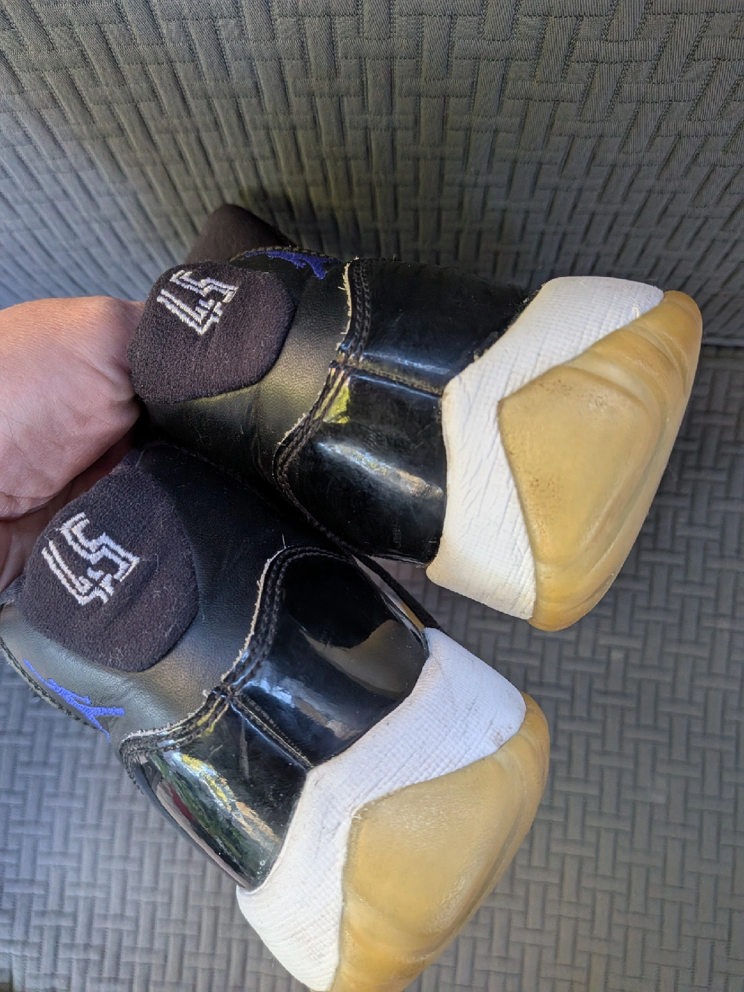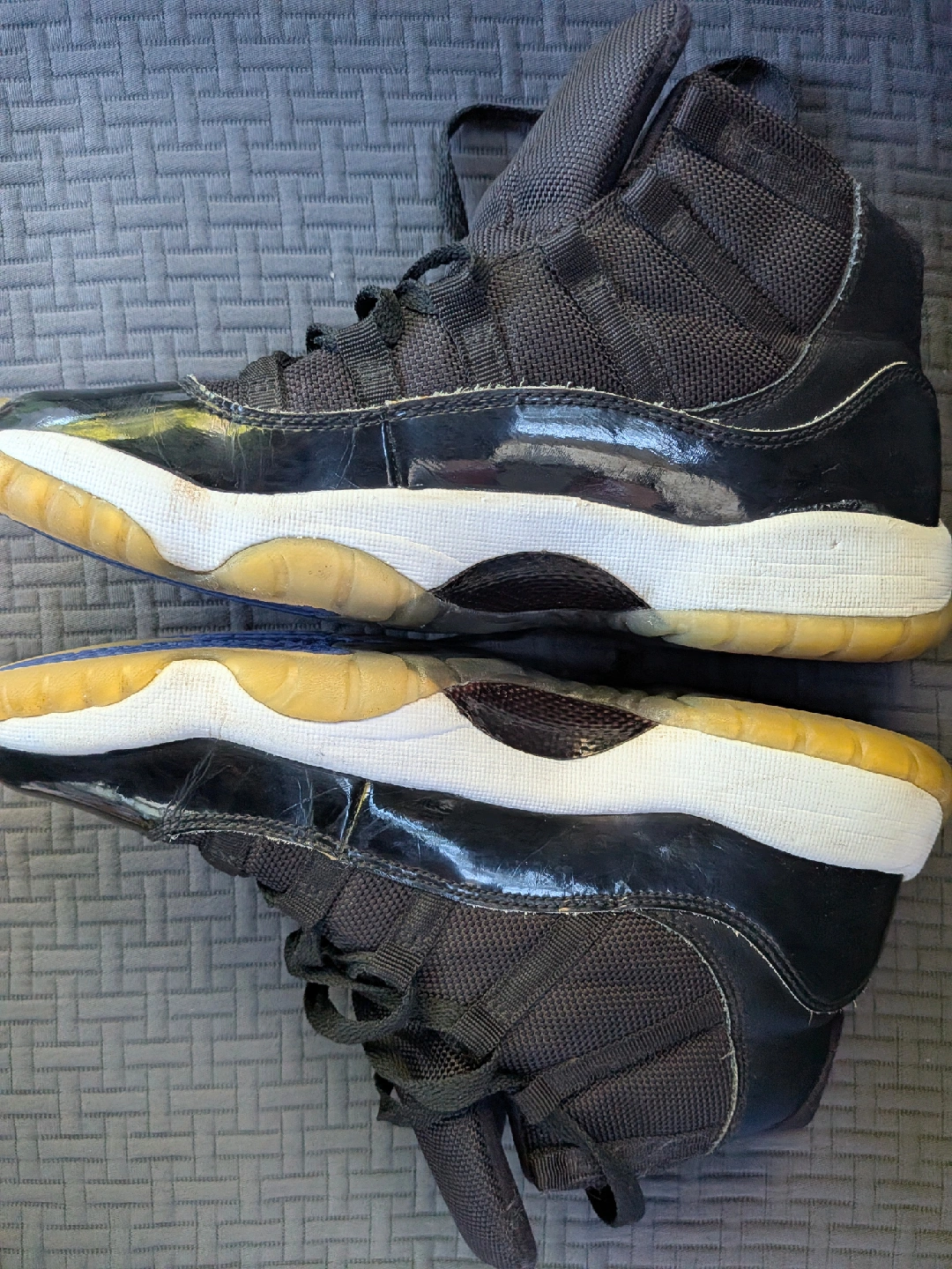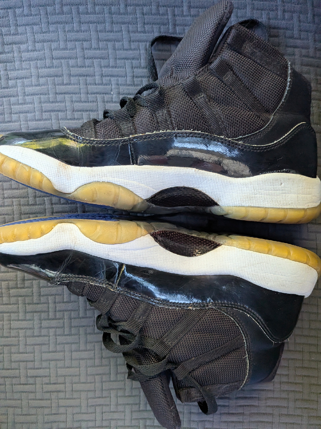 Selling a pair of Air Jordan 11 Retro sneakers in black with royal blue accents. They show some signs of wear, but are still in good condition for hitting the court or rocking around town!