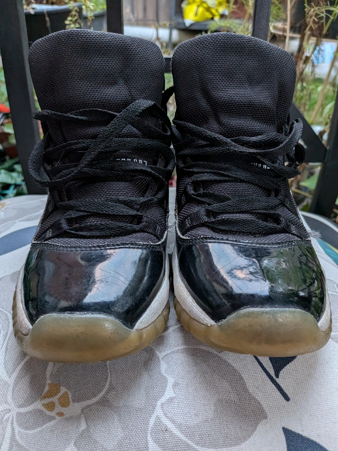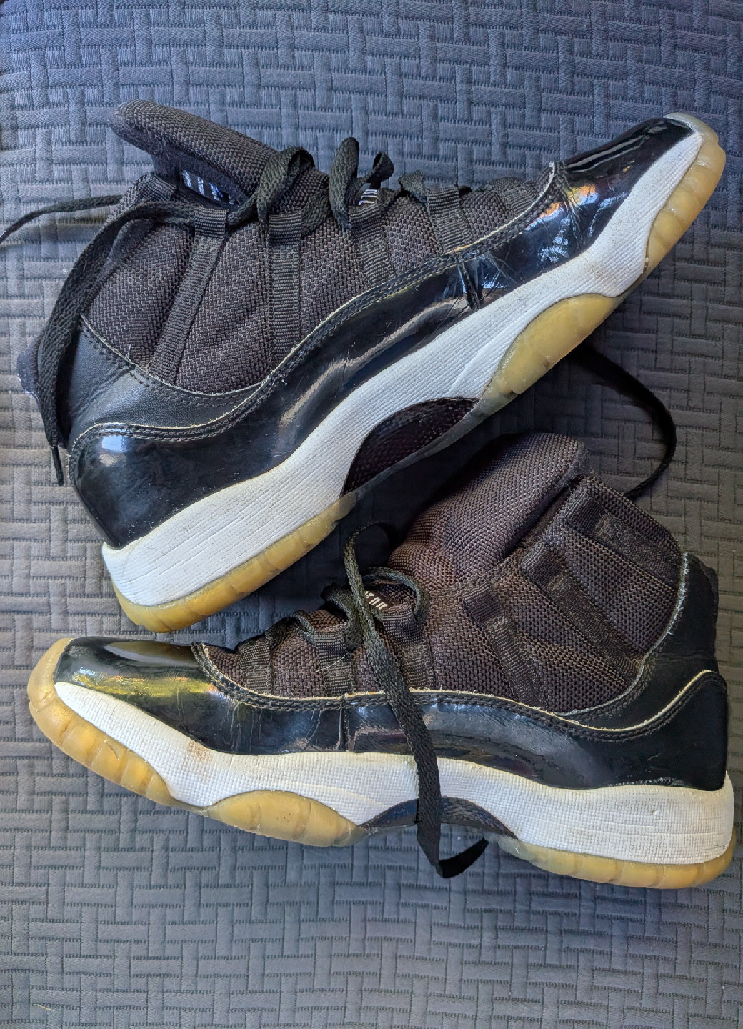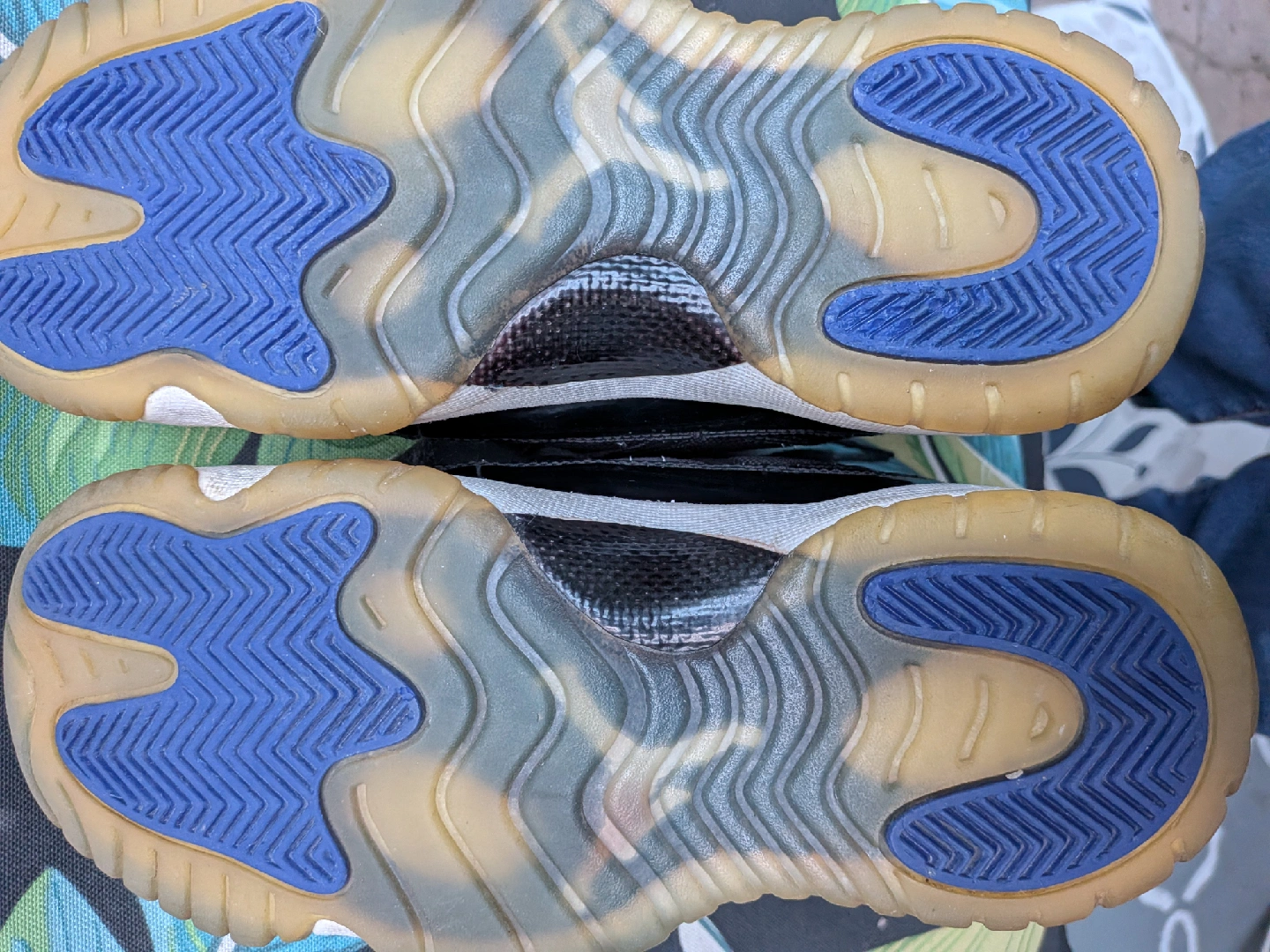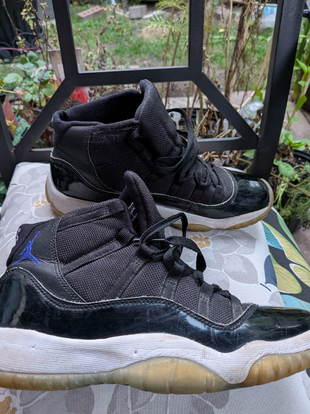Selling a pair of Air Jordan 11 Retro sneakers in black with royal blue accents. They show some signs of wear, but are still in good condition for hitting the court or rocking around town!