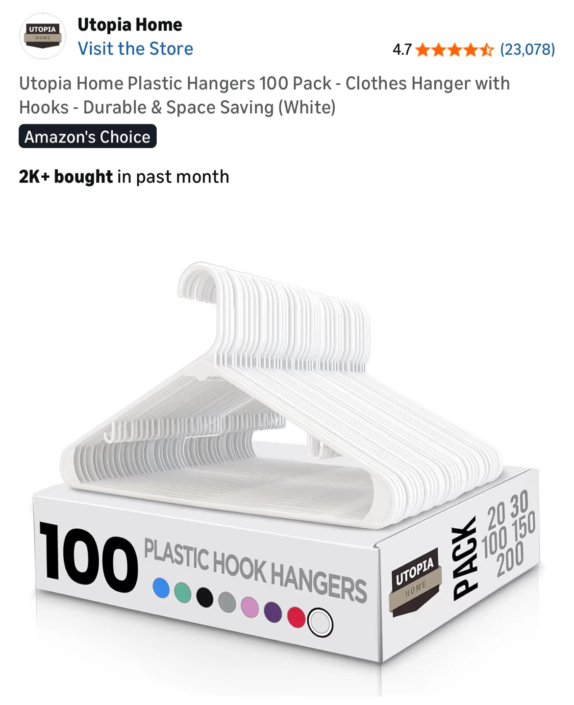 Selling a pack of 100 Utopia Home plastic hangers! These are great for organizing your closet and keeping your clothes neat. The hangers are white and made of durable plastic. Each hanger measures 16 x 8.8 inches, perfect for hanging shirts, skirts, coats, and more. They also have built-in hooks for keeping your tops and clothing accessories handy