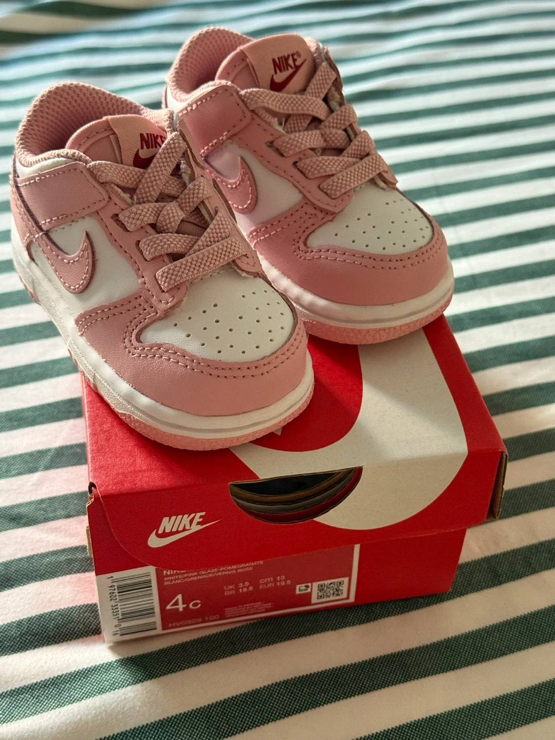 These adorable Nike Dunk Low sneakers are in a sweet pink glaze and pomegranate colorway! They are size 4c and come in the original box. Perfect for your little one's first steps!
