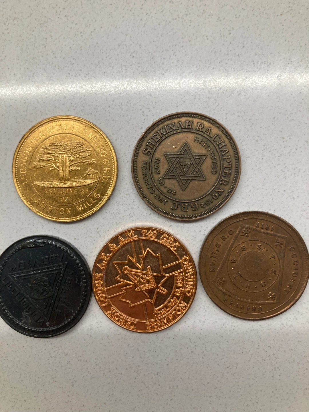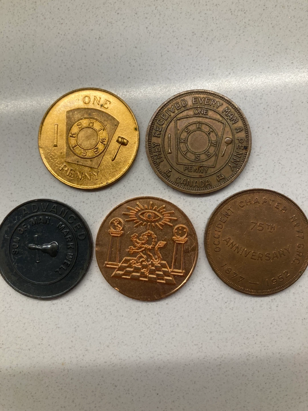A set of five collectible Masonic pennies with unique designs and inscriptions. Great for collectors or those interested in Masonic history
