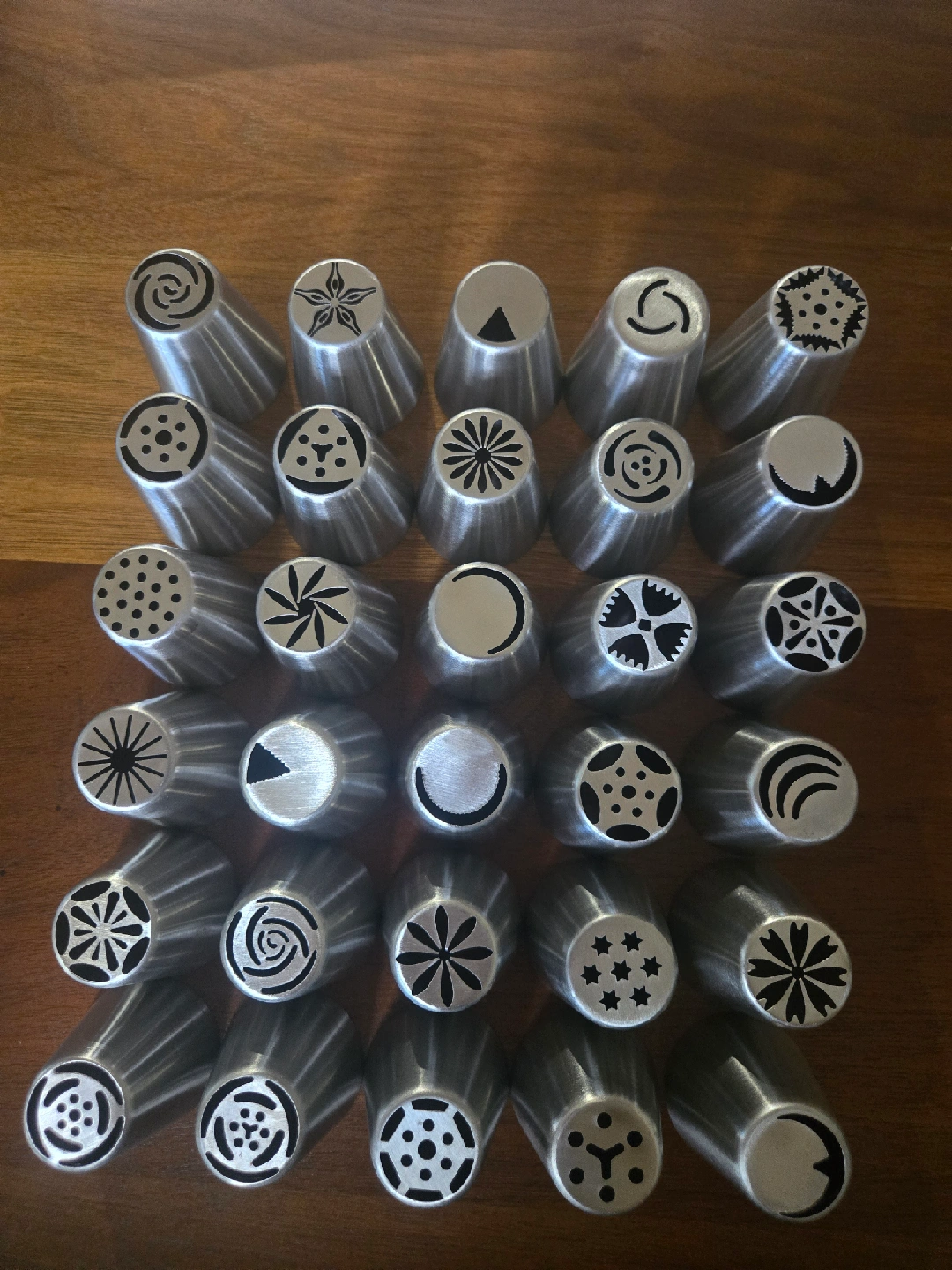 I'm selling a set of cake decorating piping tips! This set includes a variety of tips for creating different designs and patterns on your cakes and cupcakes. Perfect for both beginners and experienced bakers looking to add a professional touch to their creations