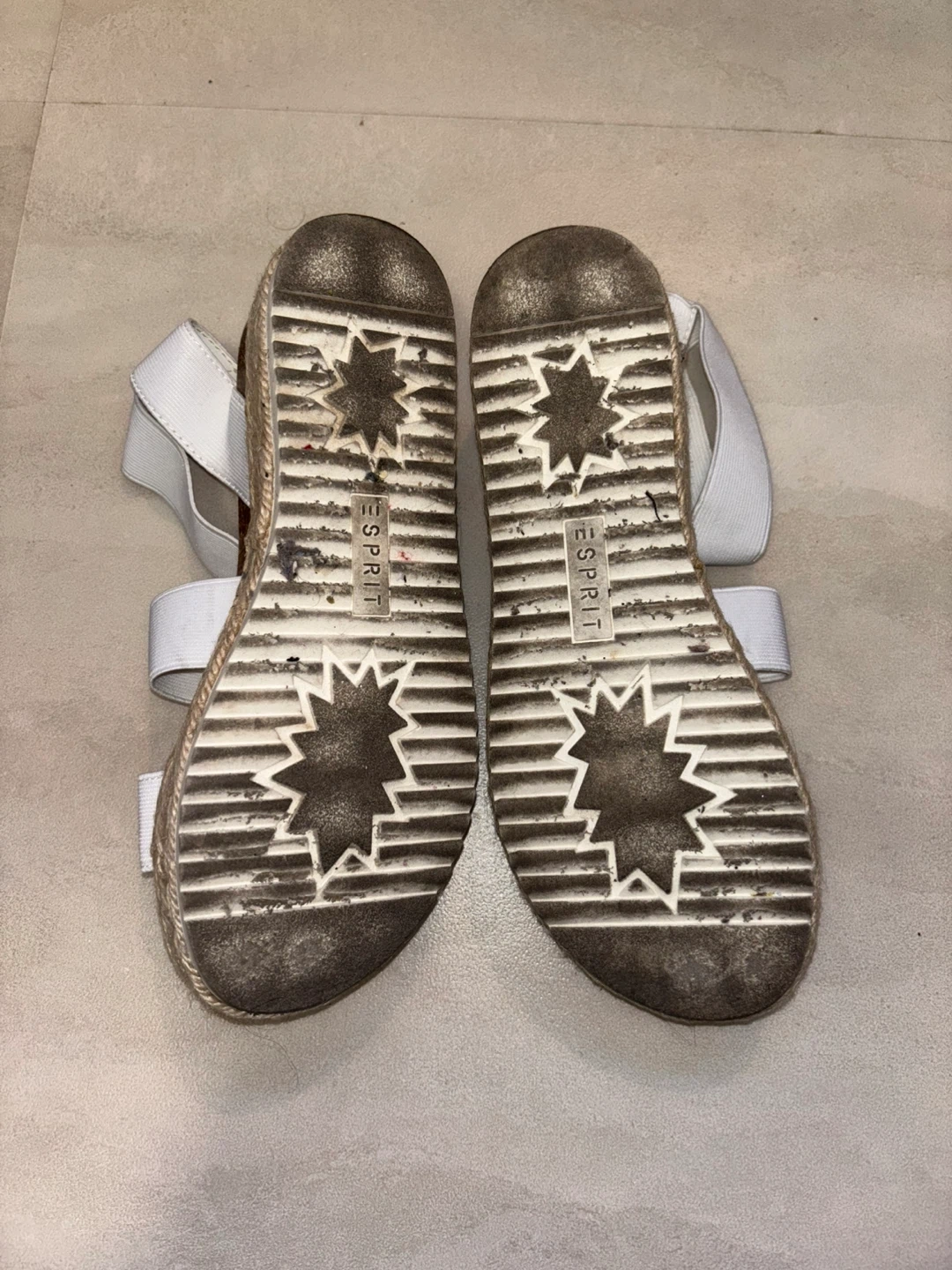 These are a pair of Esprit espadrille platform sandals in a size 7. They have a white textile upper and a textile/man-made outsole. They show some signs of wear on the soles, but are still in good condition!