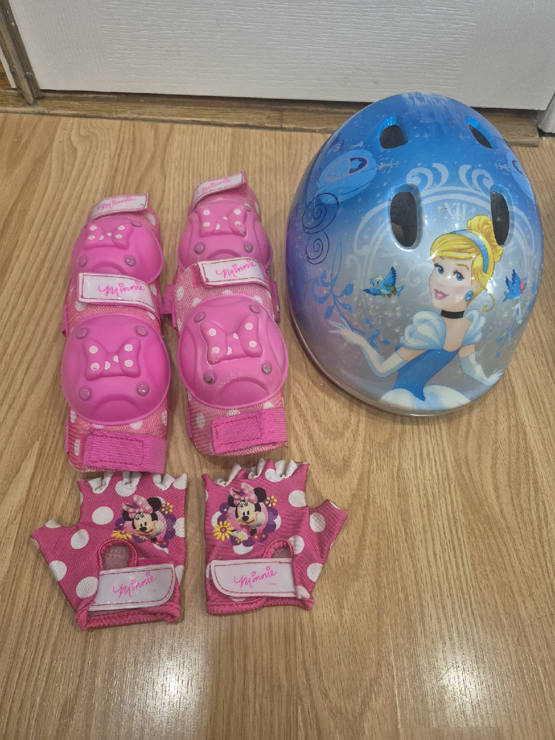 This is a super cute Disney Princess bike helmet with Minnie knee and elbow pads, and gloves! It's perfect for keeping your little one safe and stylish while they ride their bike or scooter