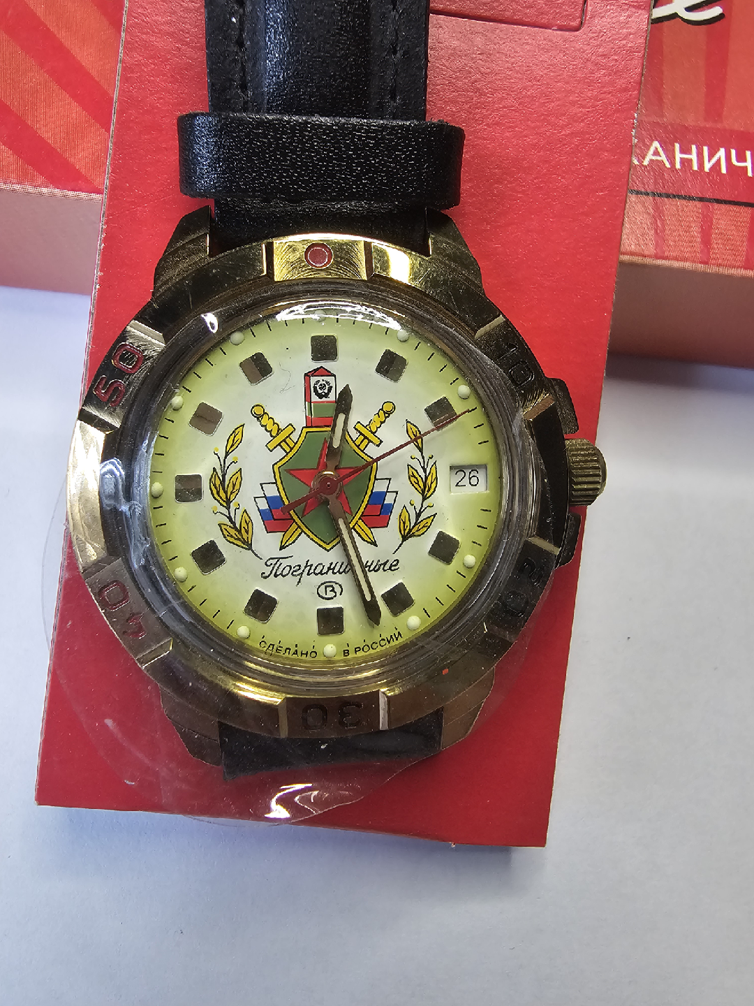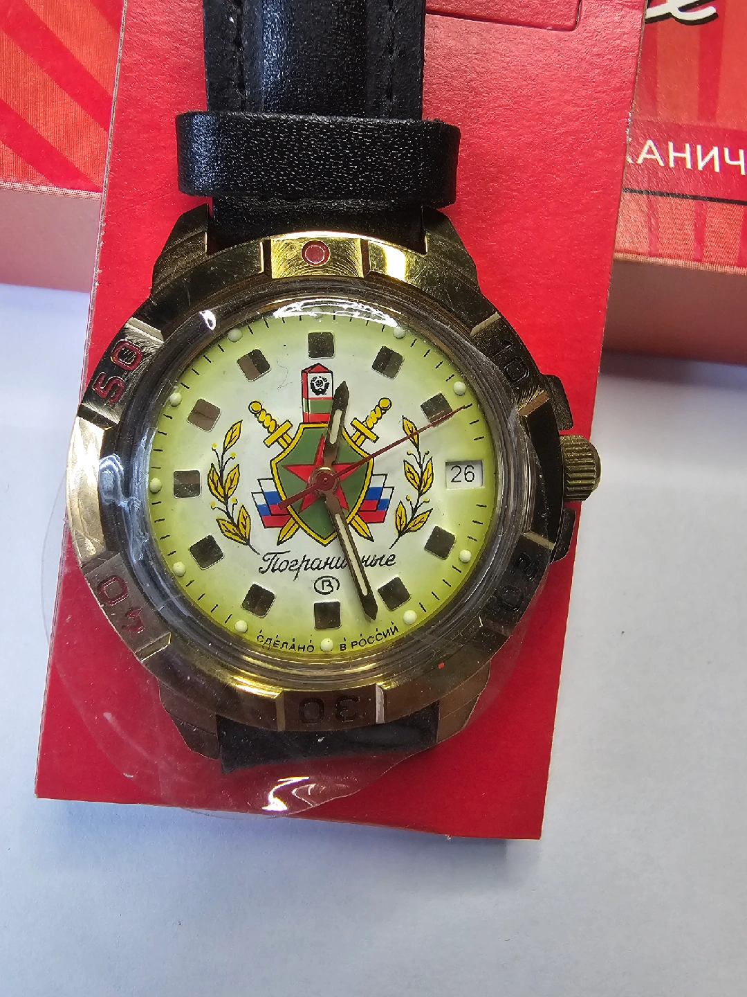 Selling a Vostok Komandirskie Pogranichnie mechanical watch. It's a Russian military-style watch with a unique design. Comes with the original box!