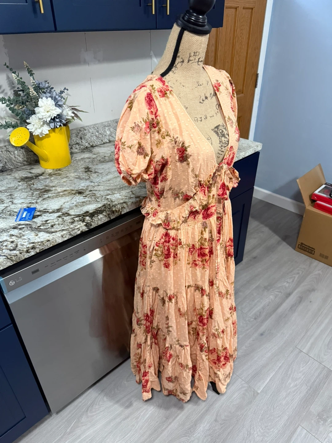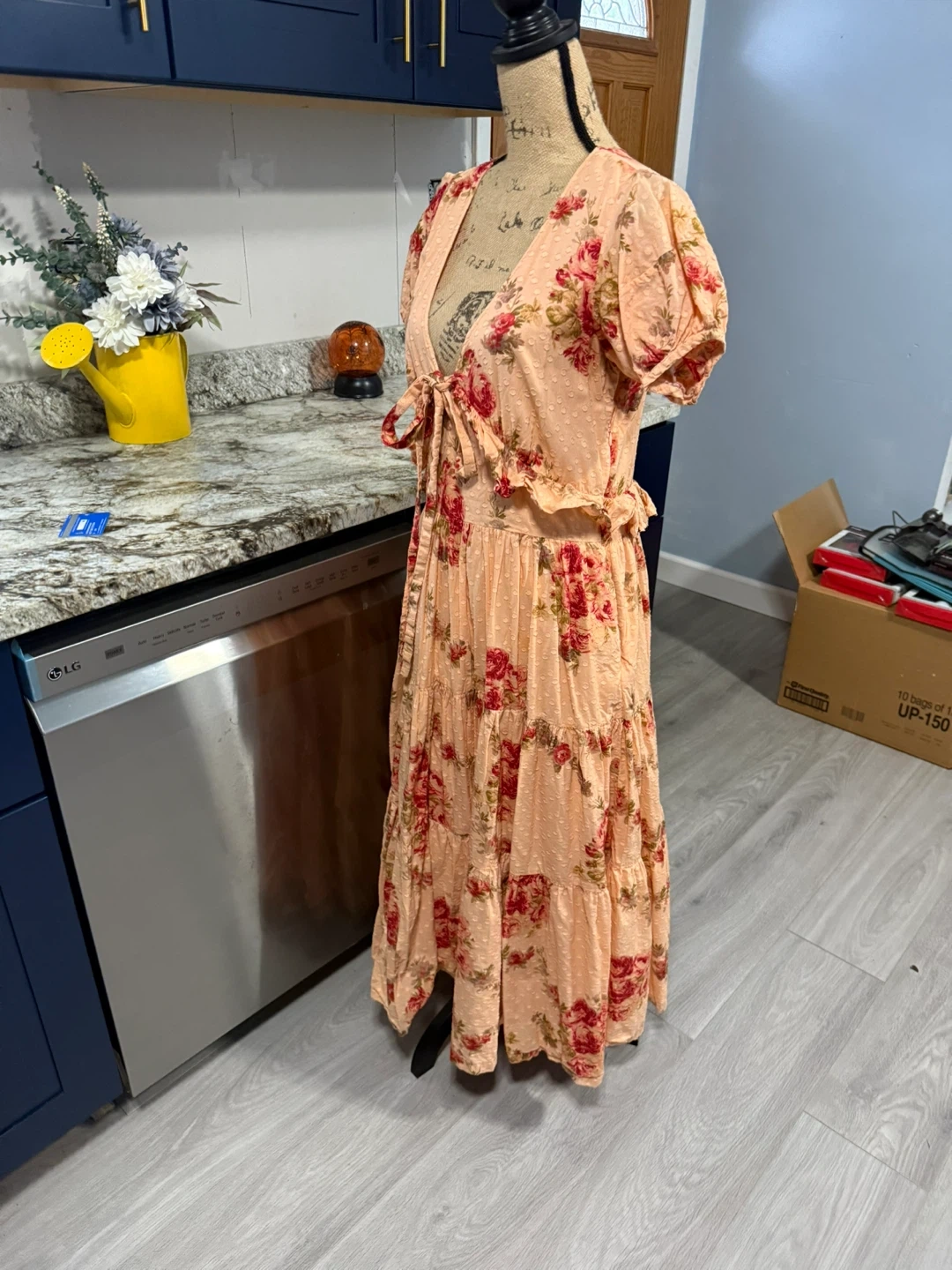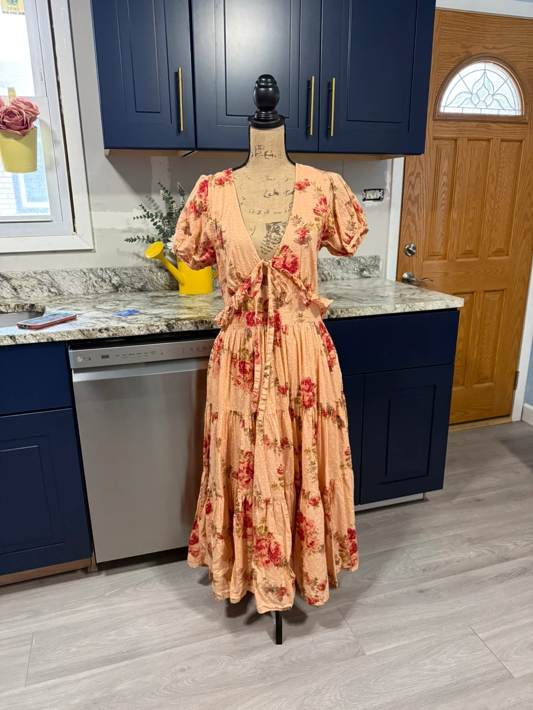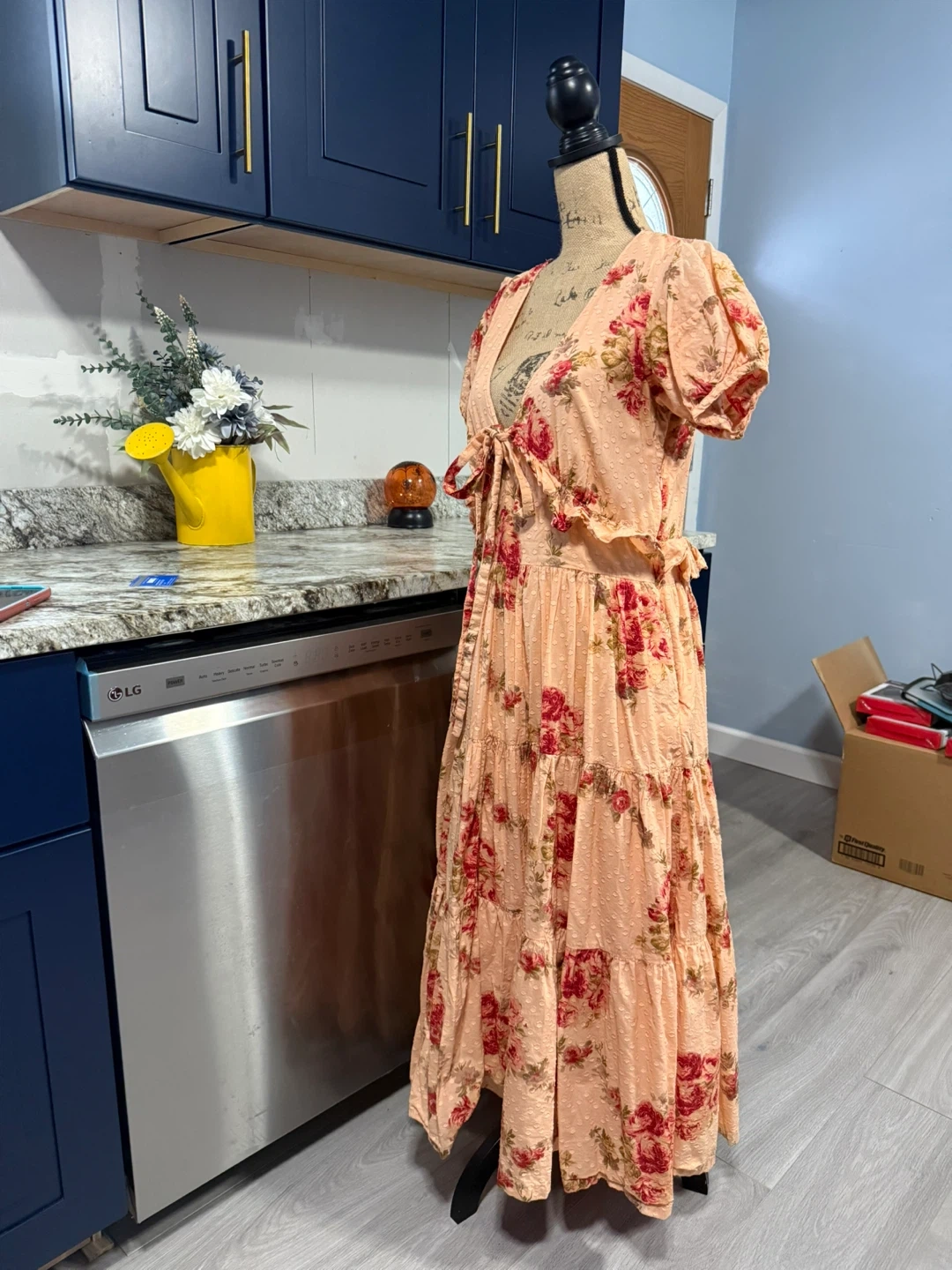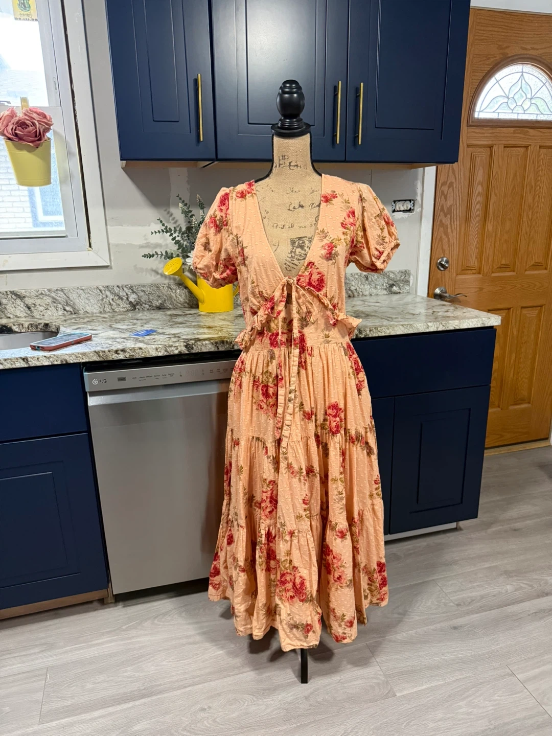 This is a lovely floral print maxi dress! It features a tie front and tiered skirt. Perfect for a summer day!