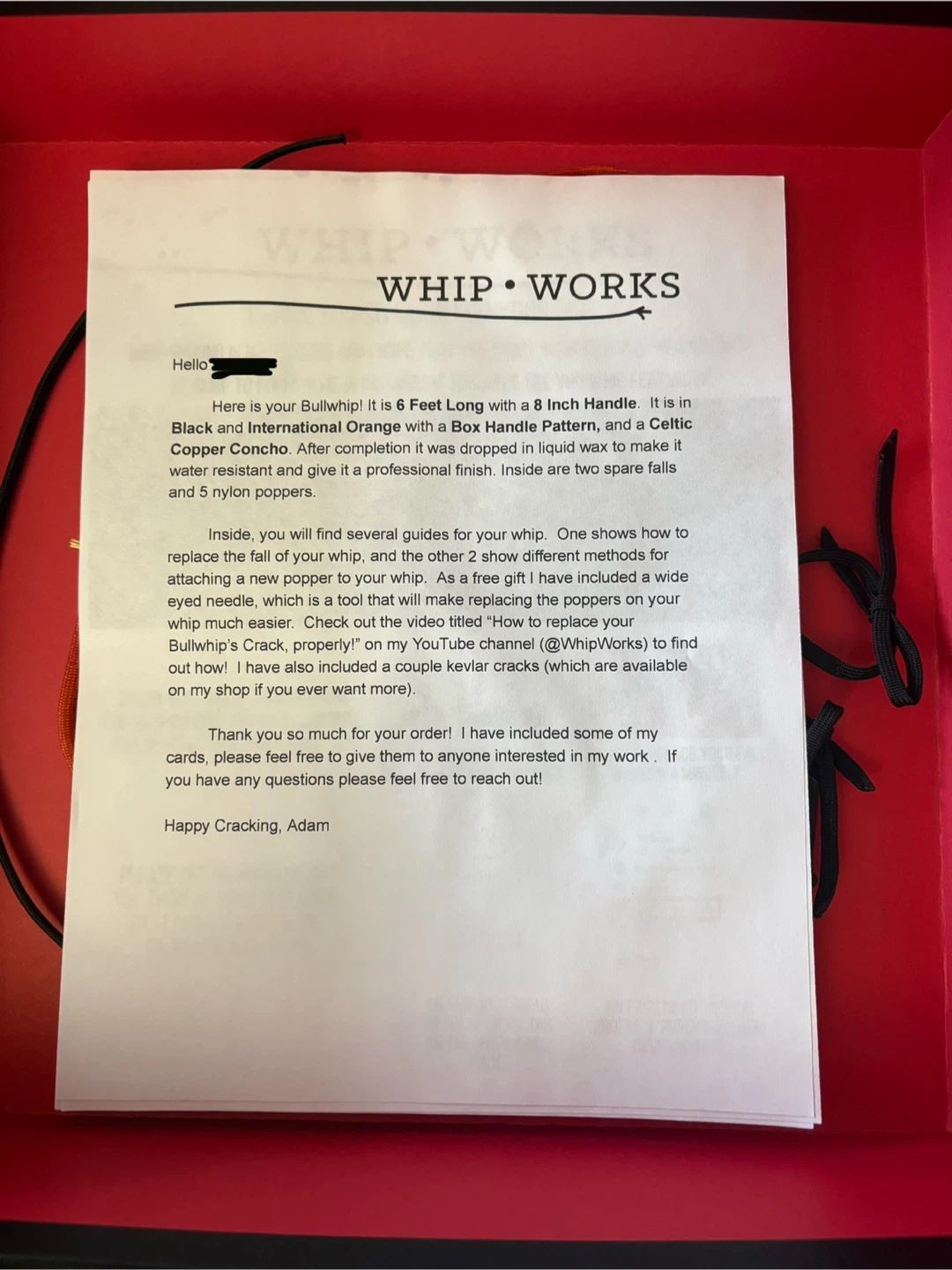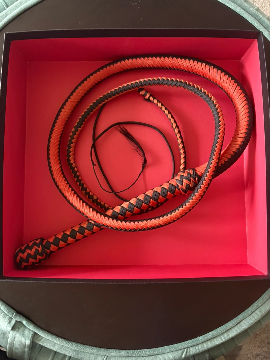 This is a Whip Works bullwhip, 6 feet long with an 8-inch handle. Purchased originally for $600 on Etsy (custom made).