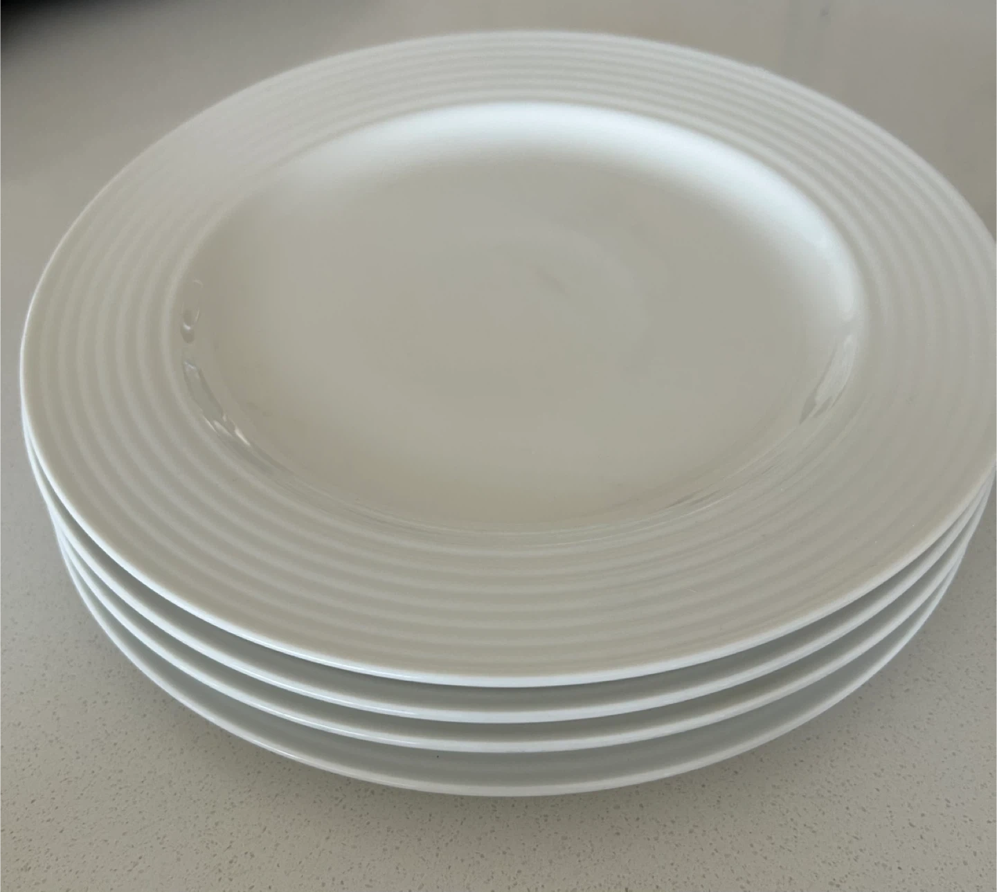 Selling a set of four simple white dinner plates. They're in great shape and ready for a new home!