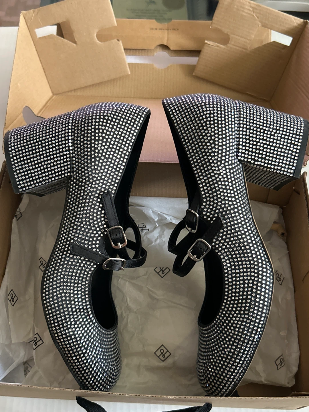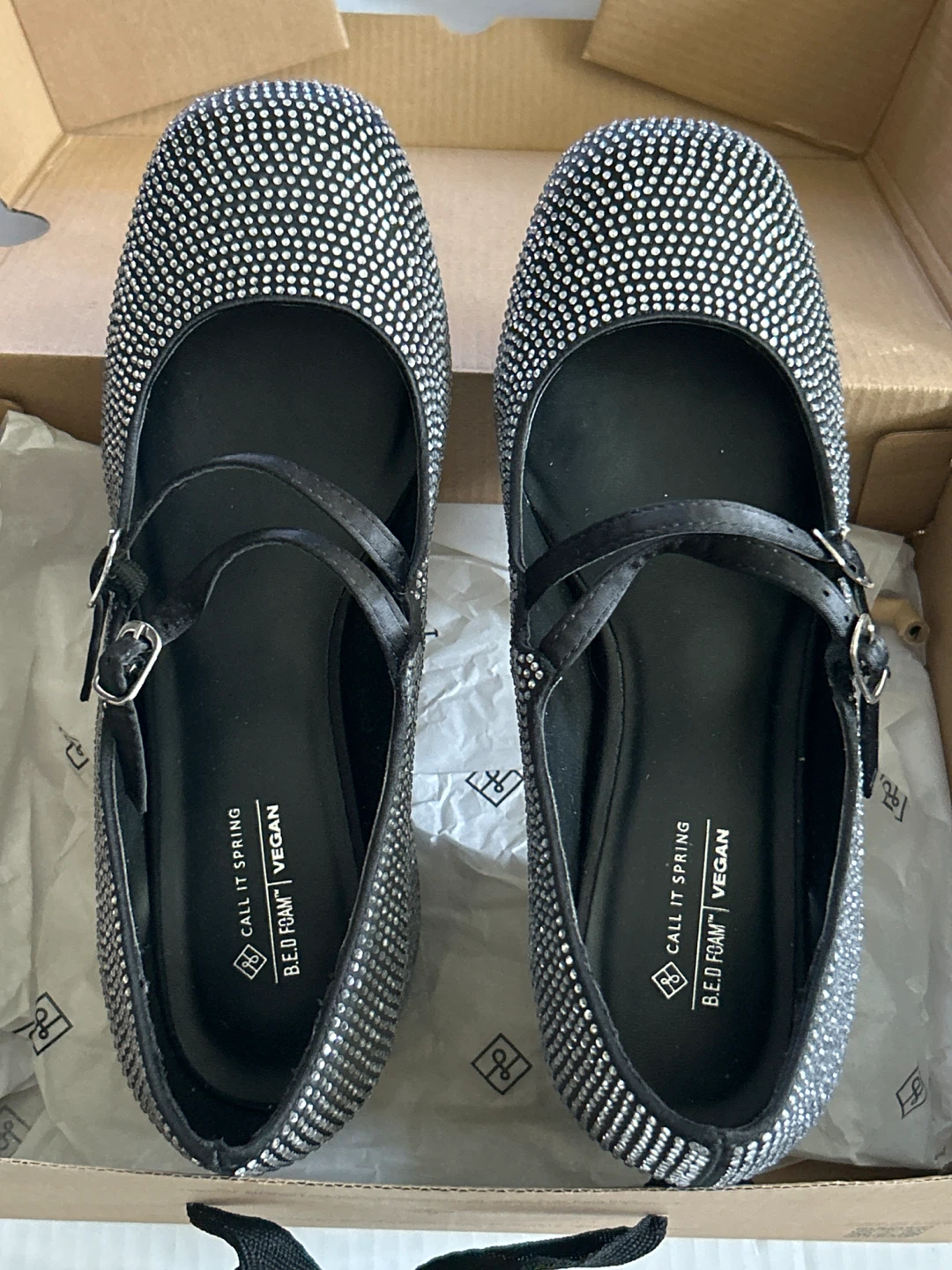 These super cute Call It Spring Mary Janes are in excellent condition! They're black with all-over rhinestones and have a vegan B.E.D Foam insole for extra comfort. Comes with the original box! A few rhinestones are missing and you can see them in the pictures provided. Please view them all.