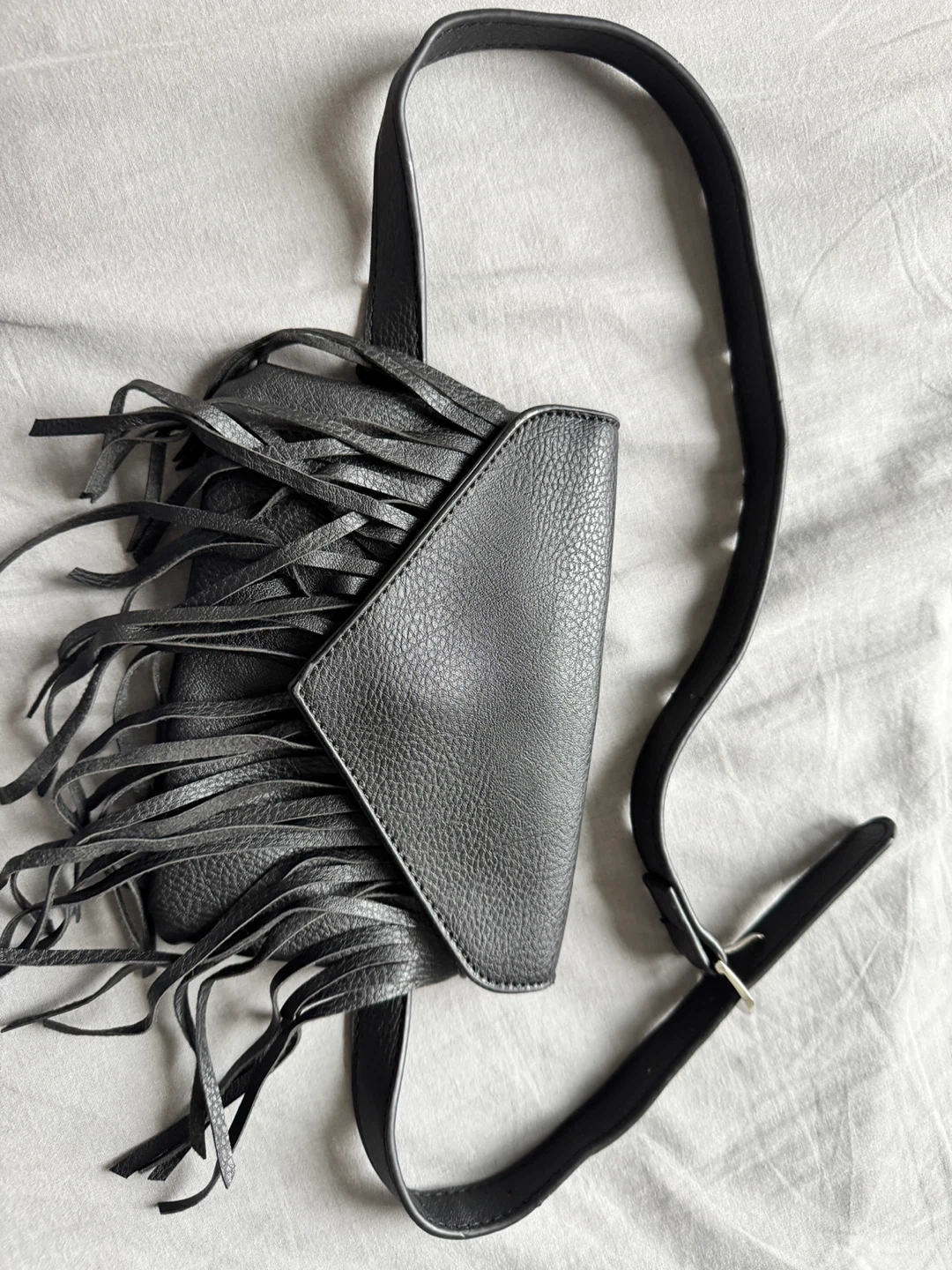 Cute black crossbody bag with fringe detail! It's made of faux leather and has an adjustable strap. Perfect for adding a bit of flair to any outfit