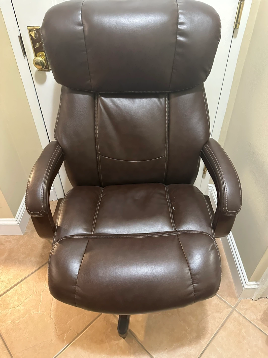 Selling a comfortable brown leather executive office chair. It's in good condition and perfect for a home office or study. The chair features a high back, padded armrests, and a sturdy base for support.
