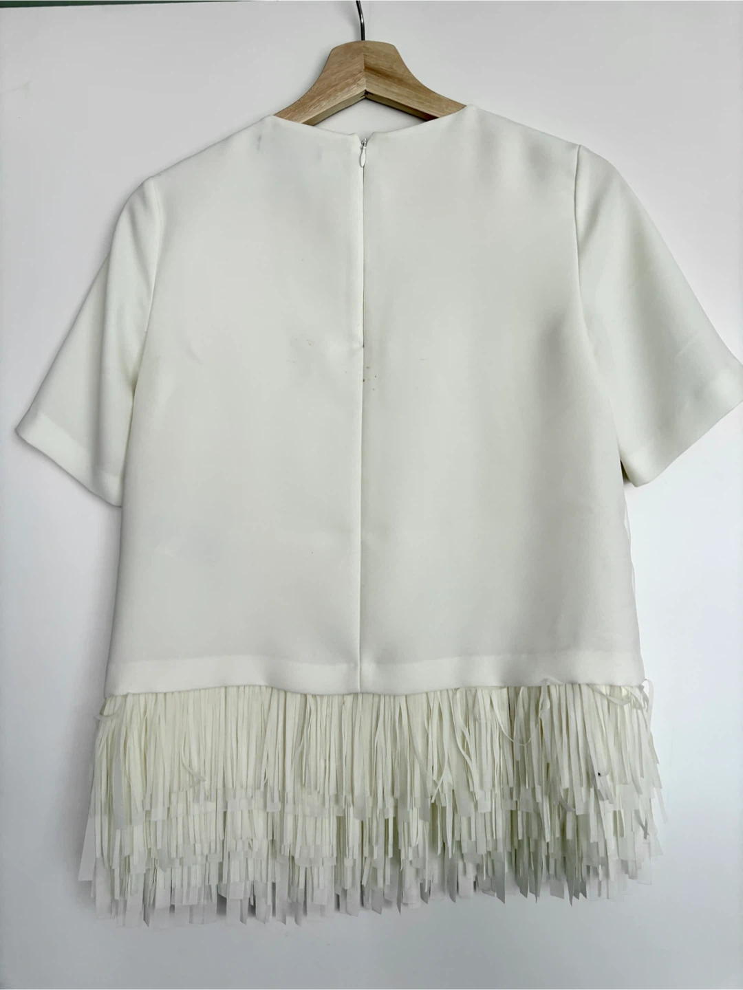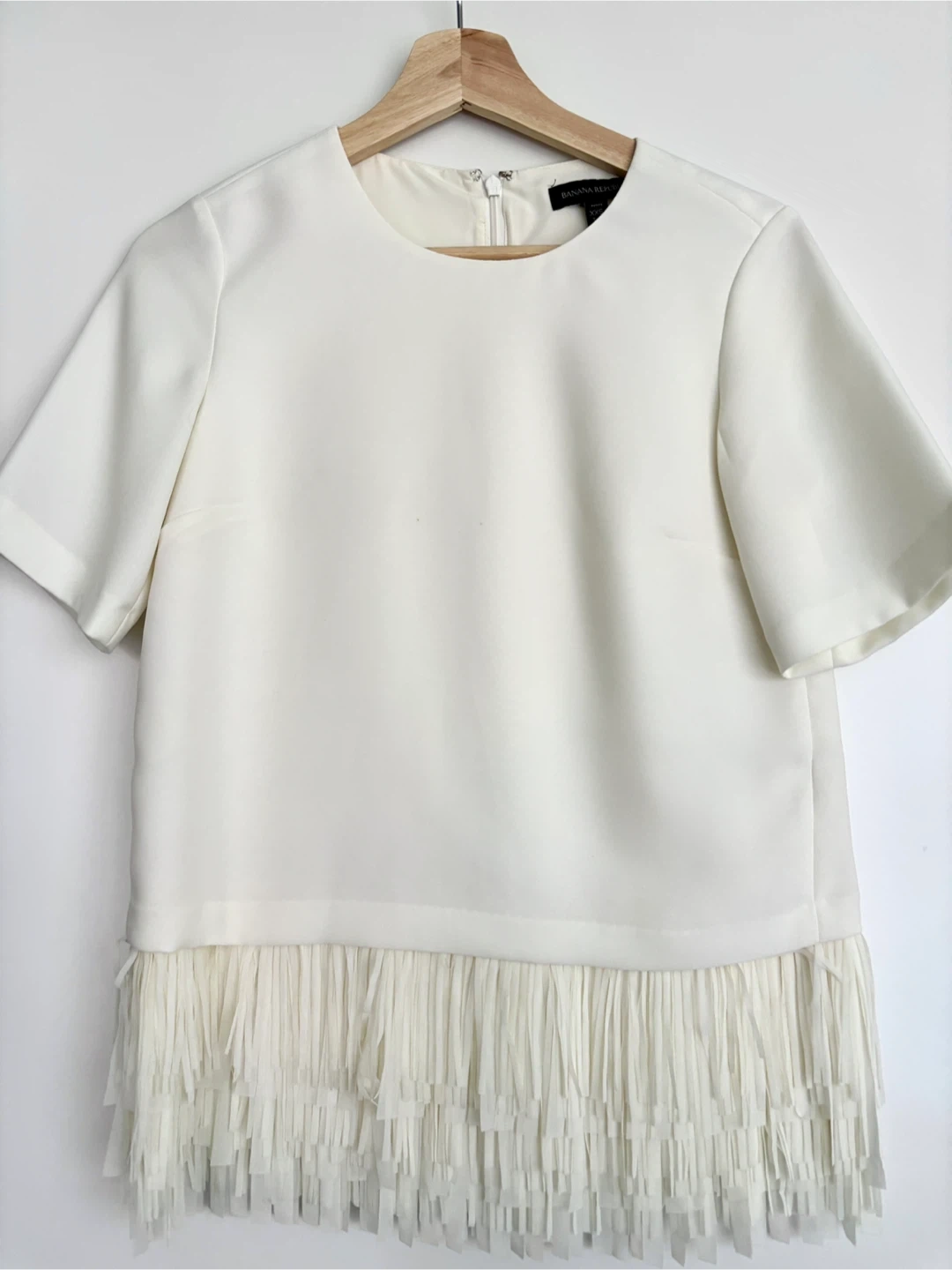 It's a lovely white colour with a fun fringe detail at the bottom, which is great for going out, holiday events, etc.