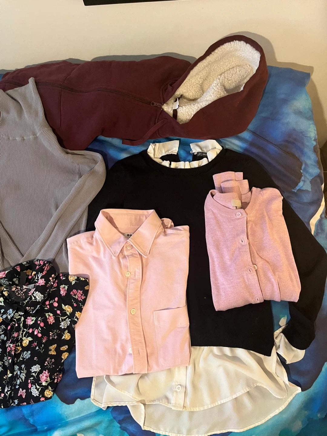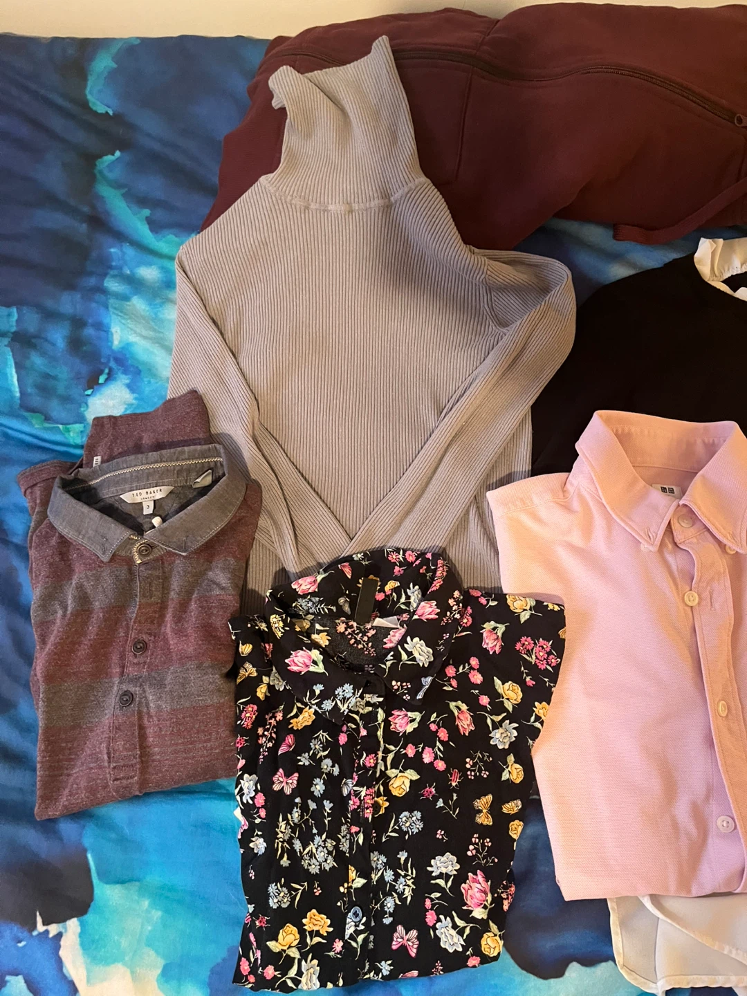 I mixed lot of clothing. There's a variety of brands and styles included, such as a floral print shirt, a pink button-down, a grey turtleneck sweater, and more! All in good condition and ready for a new home