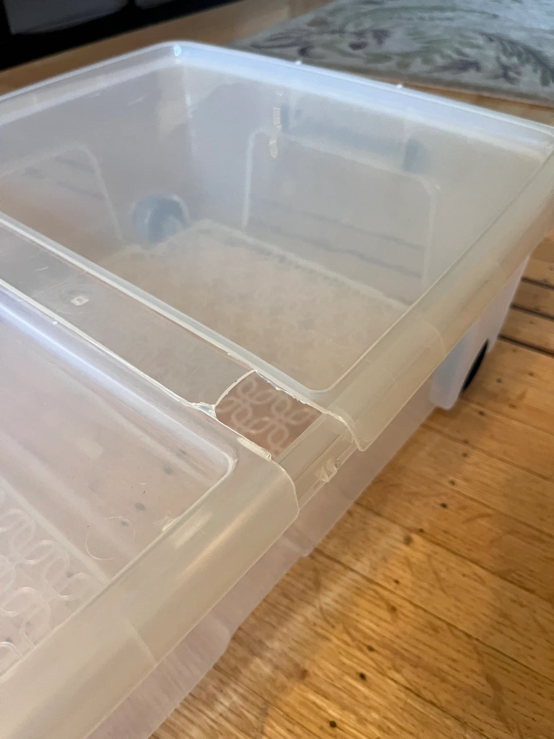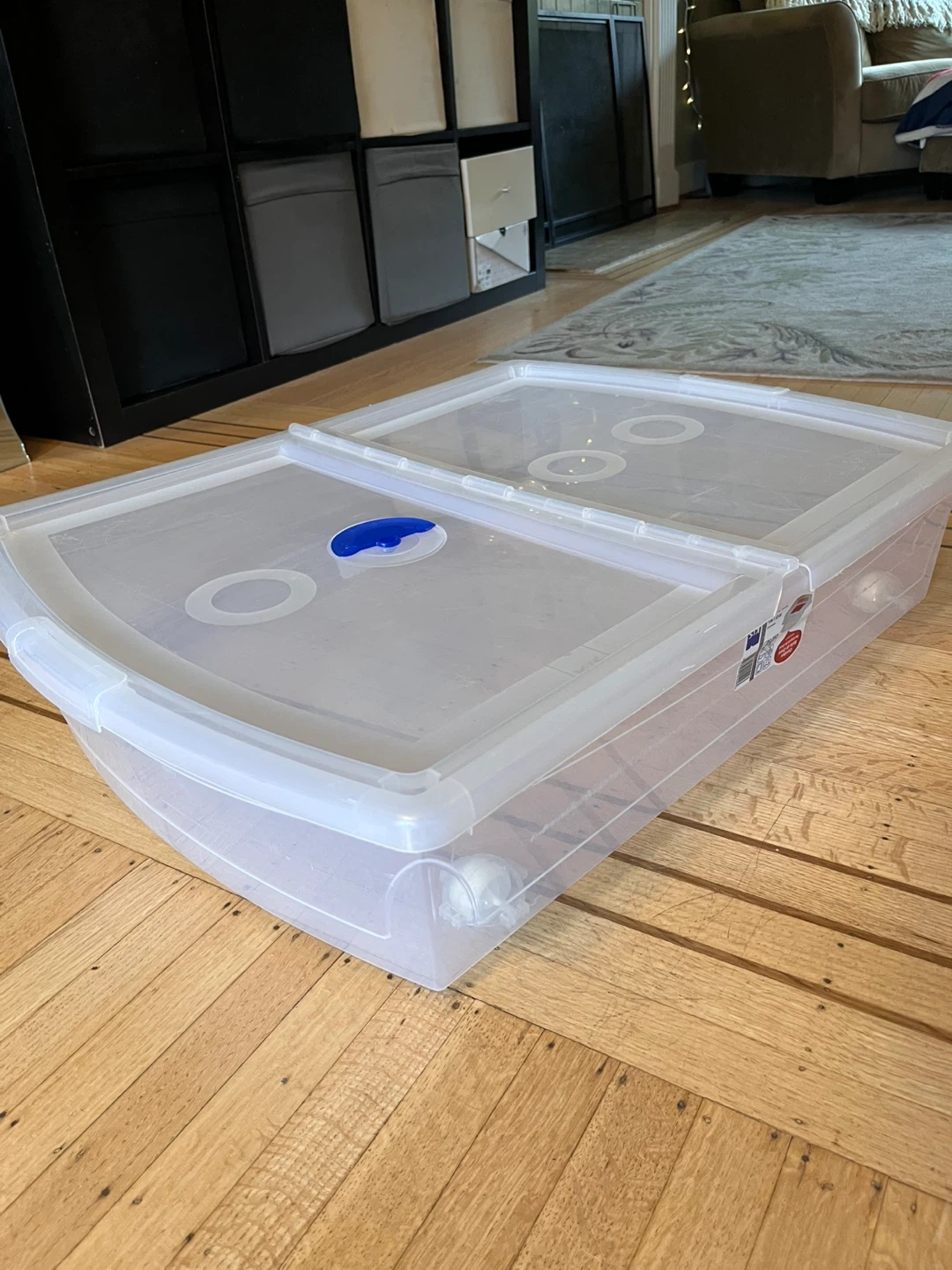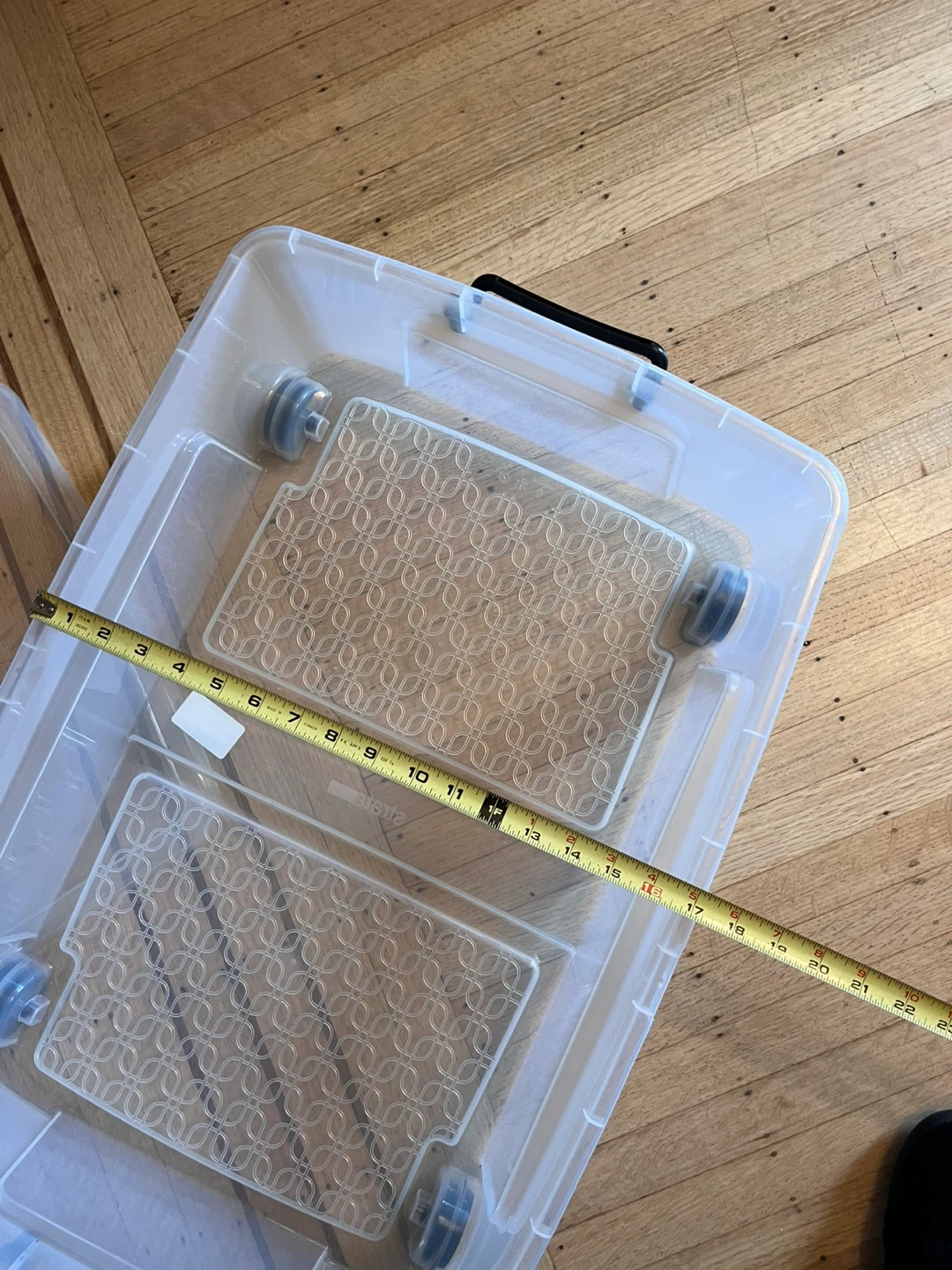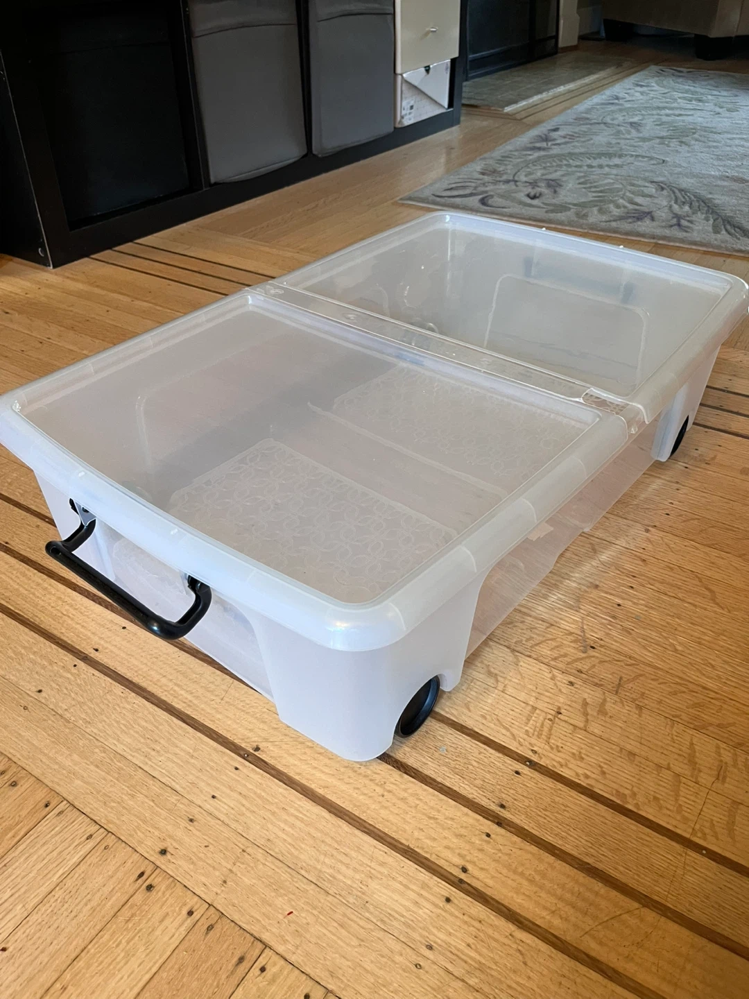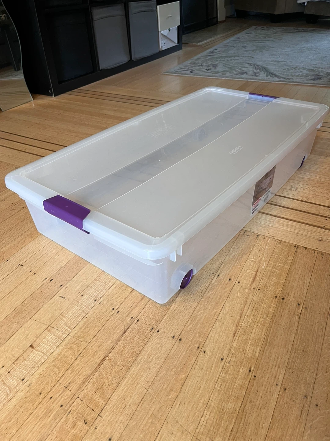 Perfect for storing items under your bed or in other tight spaces, great for maximizing space! It has wheels for easy movement and is in good condition.