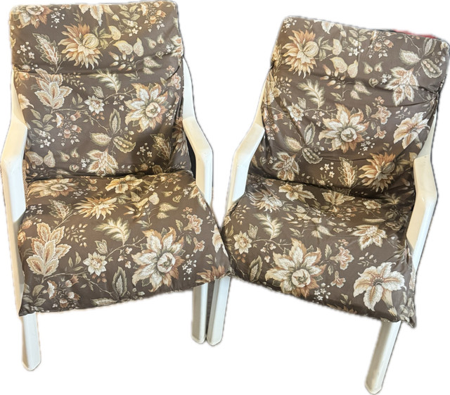 Here are some details: * Brand: Grosfillex * Model: Pacific Fanback * Colour: White * Style: Stacking Armchair. I'm pricing these at $50 each. If the ad is up, the chairs are available!